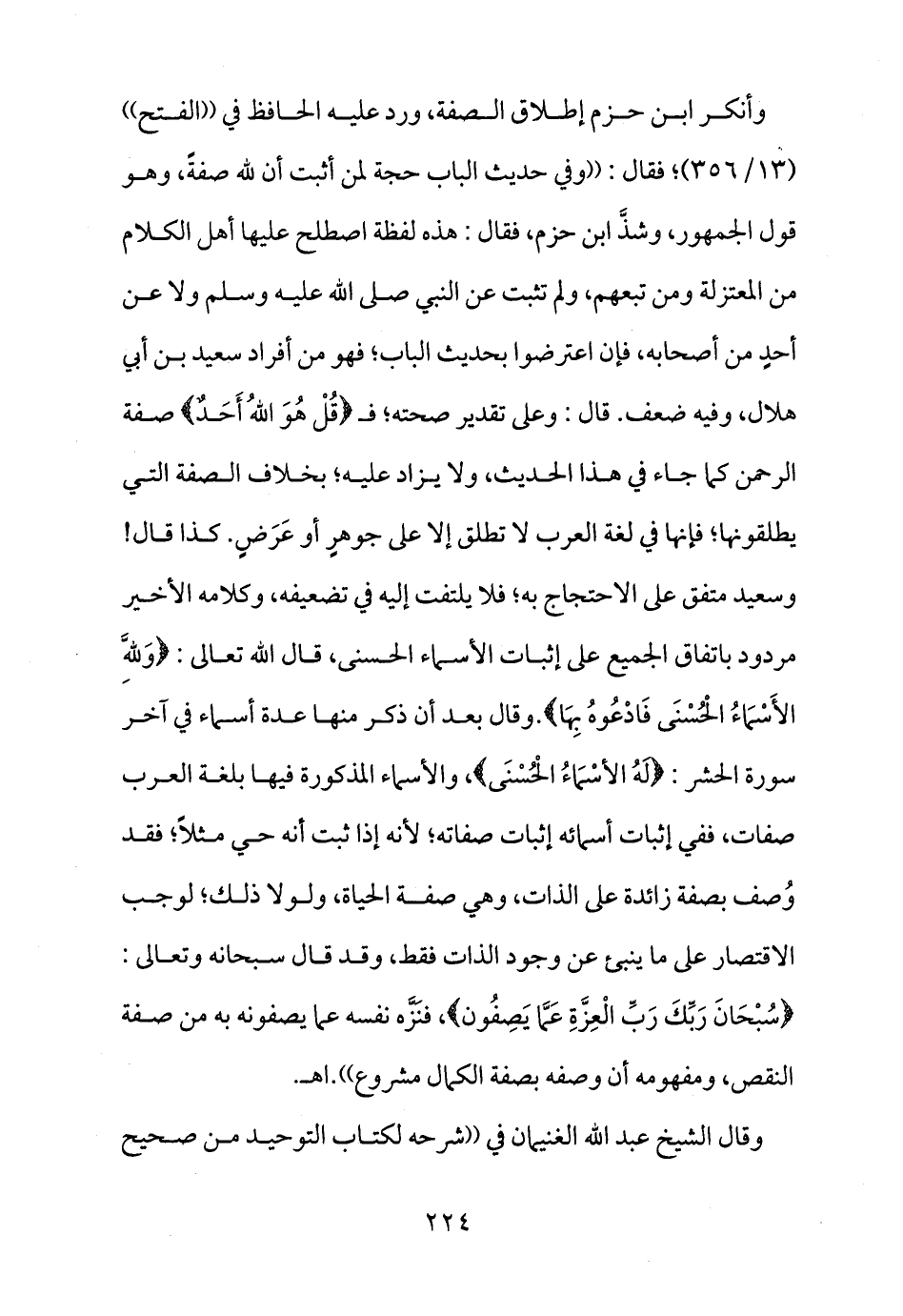 وأنكر ابن حزم إطلاق الصفة، ورد عليه الحافظ في ((الفتح)) (13/356) ؛ فقال: ((وفي حديث الباب حجة لمن أثبت أن لله صفةً، وهو قول الجمهور، وشذَّ ابن حزم، فقال: هذه لفظة اصطلح عليها أهل الكلام من المعتزلة ومن تبعهم، ولم تثبت عن النبي صلى الله عليه وسلم ولا عن أحدٍ من أصحابه، فإن اعترضوا بحديث الباب؛ فهو من أفراد سعيد بن أبي هلال، وفيه ضعف. قال: وعلى تقدير صحته؛ فـ {قُلْ هُوَ اللهُ أَحَدٌ} صفة الرحمن كما جاء في هذا الحديث، ولا يزاد عليه؛ بخلاف الصفة التي يطلقونها؛ فإنها في لغة العرب لا تطلق إلا على جوهرٍ أو عَرَضٍ. كذا قال! وسعيد متفق على الاحتجاج به؛ فلا يلتفت إليه في تضعيفه، وكلامه الأخير مردود باتفاق الجميع على إثبات الأسماء الحسنى، قال الله تعالى: {وَلِلَّهِ الأَسْمَاءُ الْحُسْنَى فَادْعُوهُ بِهَا} .وقال بعد أن ذكر منها عدة أسماء في آخر سورة الحشر: {لَهُ الأسْمَاءُ الْحُسْنَى} ، والأسماء المذكورة فيها بلغة العرب صفات، ففي إثبات أسمائه إثبات صفاته؛ لأنه إذا ثبت أنه حي مثلاً؛ فقد وُصف بصفة زائدة على الذات، وهي صفة الحياة، ولولا ذلك؛ لوجب الاقتصار على ما ينبئ عن وجود الذات فقط، وقد قال سبحانه وتعالى: {سُبْحَانَ رَبِّكَ رَبِّ الْعِزَّةِ عَمَّا يَصِفُون} ، فنَزَّه نفسه عما يصفونه به من صفة النقص، ومفهومه أن وصفه بصفة الكمال مشروع)) .اهـ.