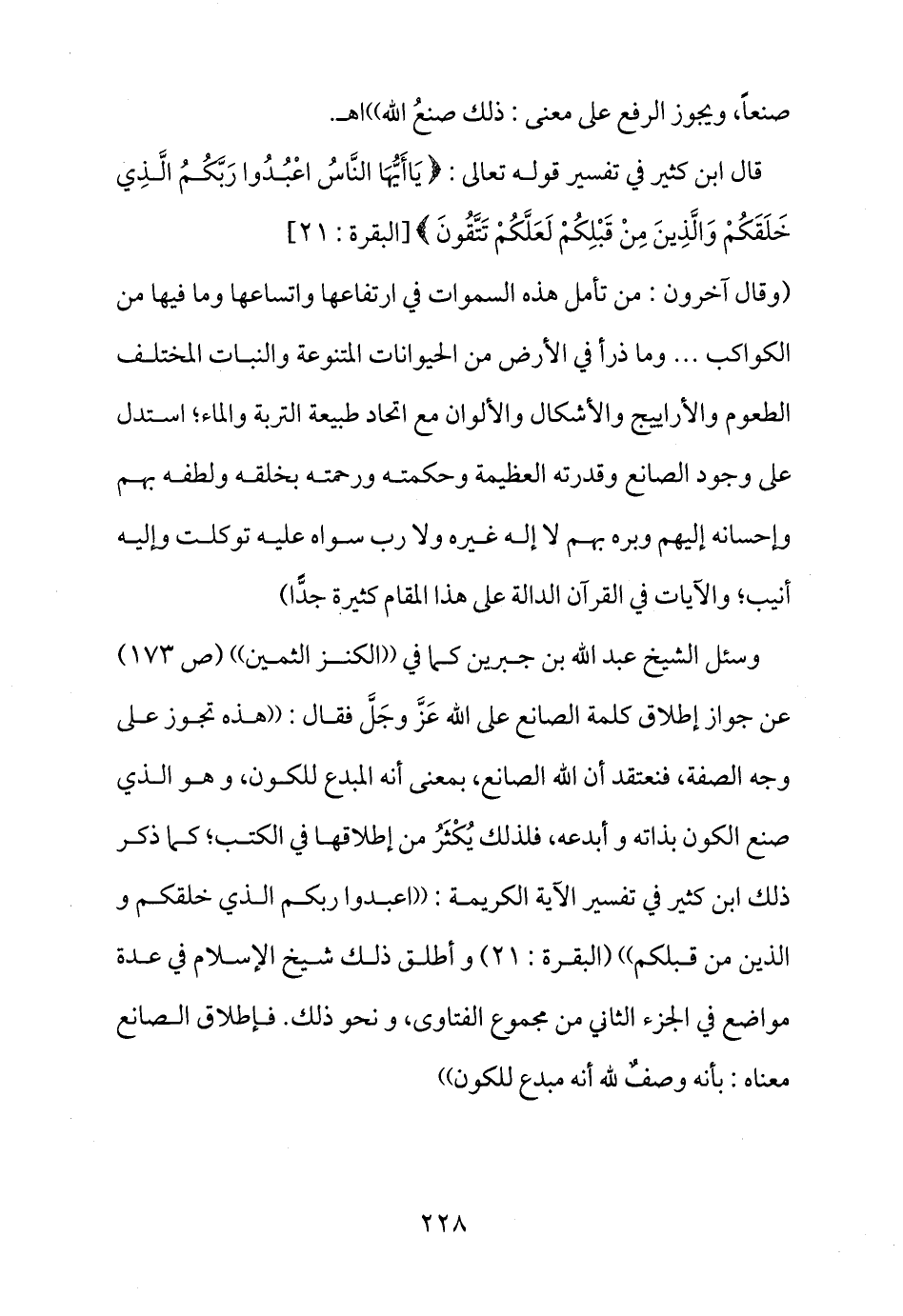 وسئل الشيخ عبد الله بن جبرين كما في ((الكنز الثمين)) (ص 173) عن جواز إطلاق كلمة الصانع على الله عَزَّ وجَلَّ فقال: ((هذه تجوز على وجه الصفة، فنعتقد أن الله الصانع، بمعنى أنه المبدع للكون، وهو الذي صنع الكون بذاته وأبدعه، فلذلك يُكْثَرُ من إطلاقها في الكتب؛ كما ذكر ذلك ابن كثير في تفسير الآية الكريمة: ((اعبدوا ربكم الذي خلقكم والذين من قبلكم)) (البقرة: 21) وأطلق ذلك شيخ الإسلام في عدة مواضع في الجزء الثاني من مجموع الفتاوى، ونحو ذلك. فإطلاق الصانع معناه: بأنه وصفٌ لله أنه مبدع للكون))