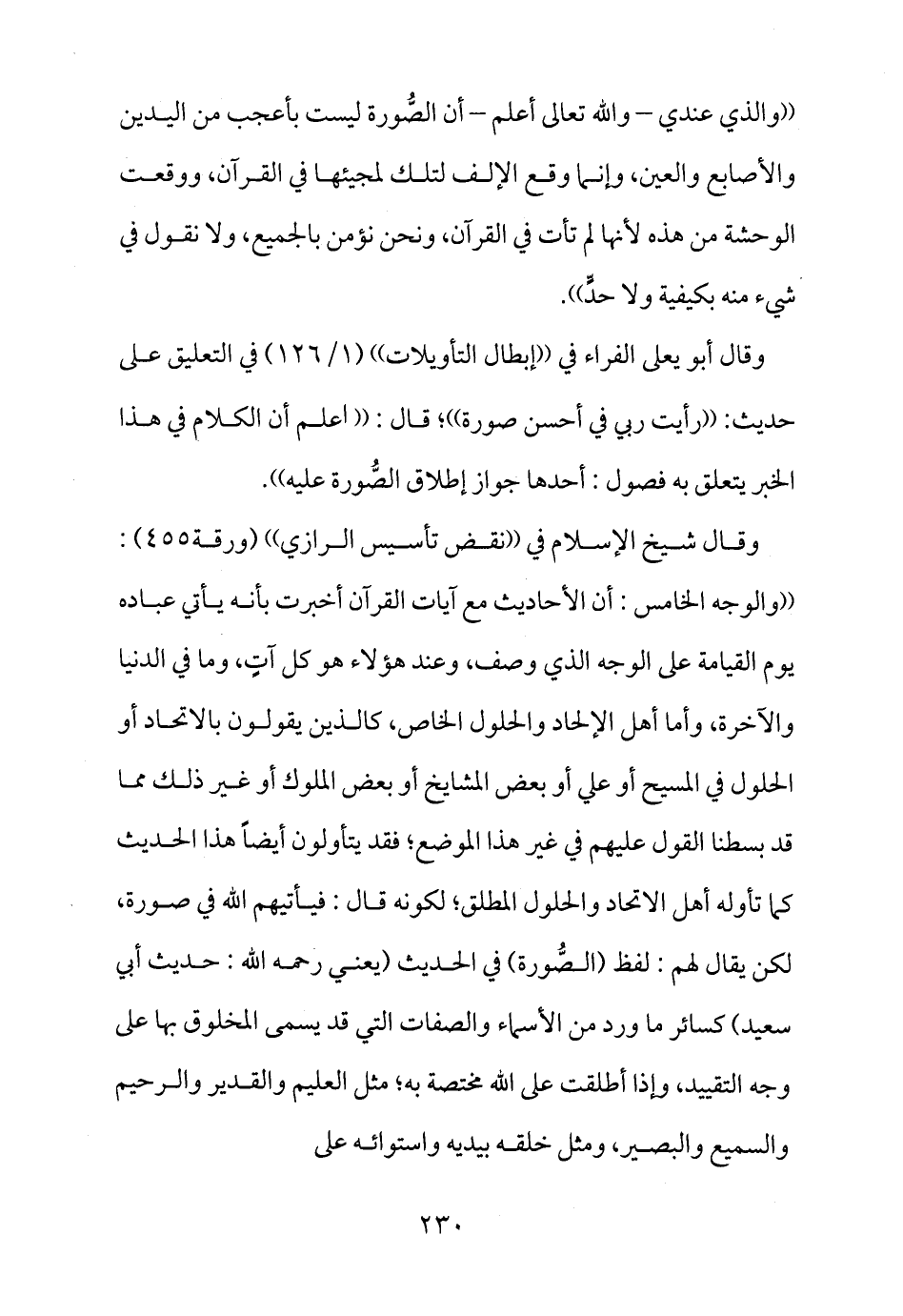 وقال أبو يعلى الفراء في ((إبطال التأويلات)) (1/126) في التعليق على حديث: ((رأيت ربي في أحسن صورة)) ؛ قال: ((اعلم أن الكلام في هذا الخبر يتعلق به فصول: أحدها جواز إطلاق الصُّورة عليه)) .