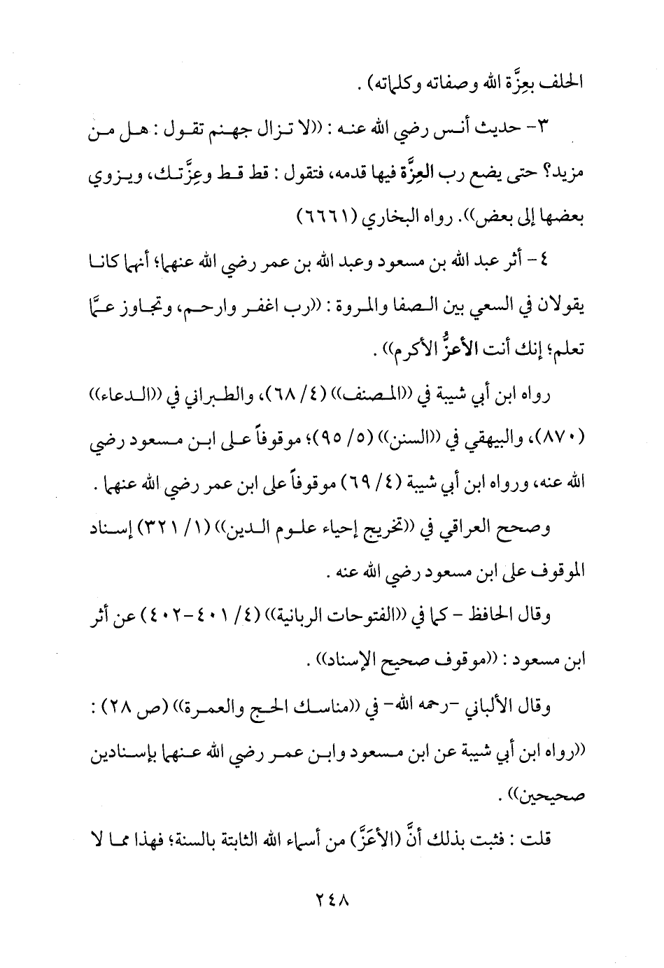 قلت: فثبت بذلك أنَّ (الأعز) من أسماء الله الثابتة بالسنة؛ فهذا مما لا