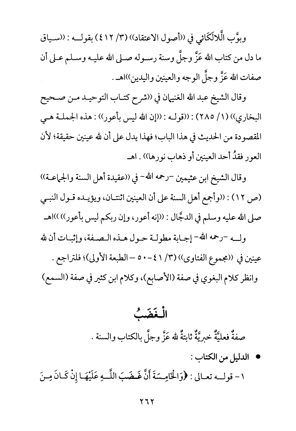 وبوَّب الَّلالَكَائي في ((أصول الاعتقاد)) (3/412) بقوله: ((سياق ما دل من كتاب الله عَزَّ وجلَّ وسنة رسوله صلى الله عليه وسلم على أن صفات الله عَزَّ وجلَّ الوجه والعينين واليدين)) اهـ.