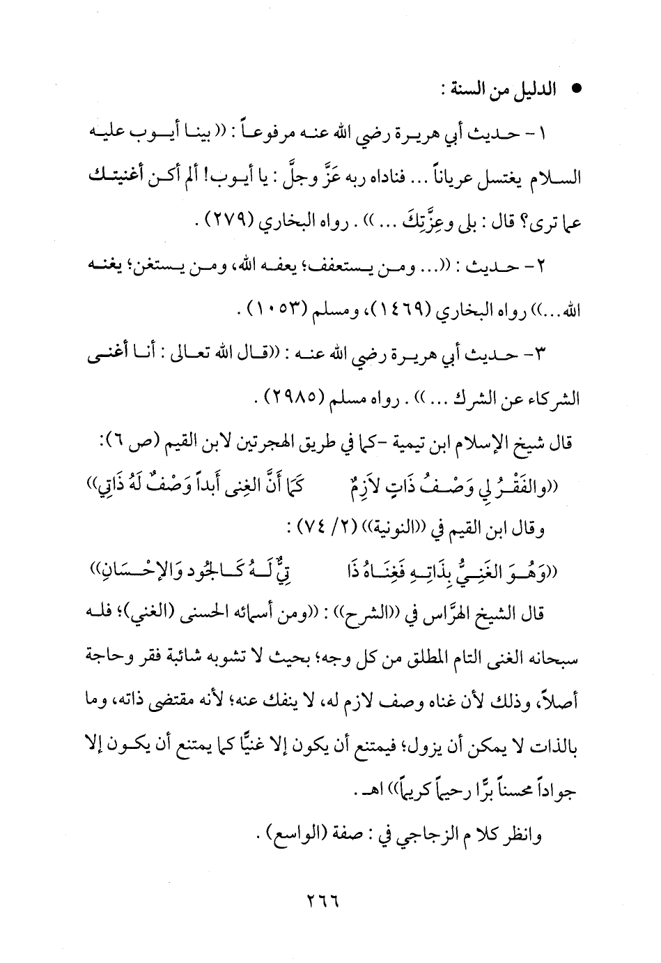 قال الشيخ الهرَّاس في ((الشرح)) : ((ومن أسمائه الحسنى (الغني) ؛ فله سبحانه الغنى التام المطلق من كل وجه؛ بحيث لا تشوبه شائبة فقر وحاجة أصلاً، وذلك لأن غناه وصف لازم له، لا ينفك عنه؛ لأنه مقتضى ذاته، وما بالذات لا يمكن أن يزول؛ فيمتنع أن يكون إلا غنيَّاً كما يمتنع أن يكون إلا جواداً محسناً برَّاً رحيماً كريماً)) اهـ.