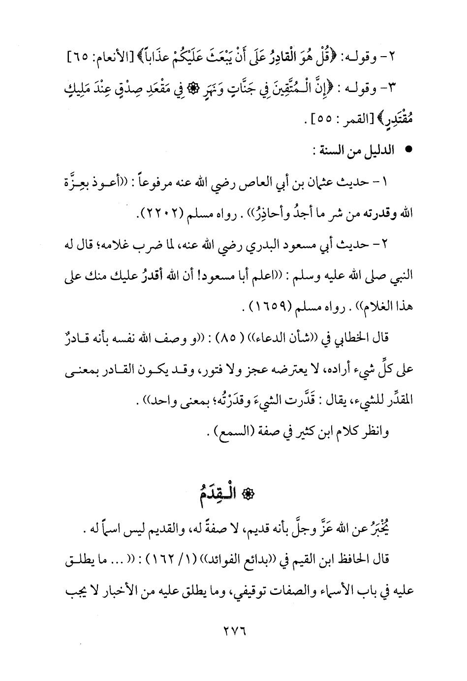 يُخْبَرُ عن الله عَزَّ وجلَّ بأنه قديم، لا صفةً له، والقديم ليس اسماً له.