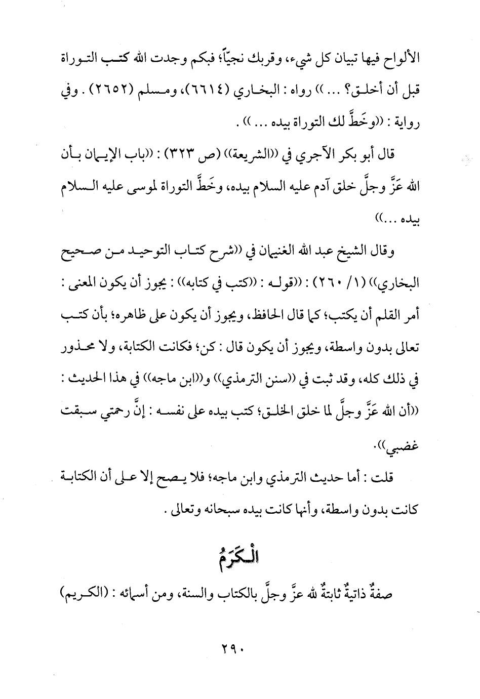 قال أبو بكر الآجري في ((الشريعة)) (ص 323) : ((باب الإيمان بأن الله عَزَّ وجلَّ خلق آدم عليه السلام بيده، وخَطَّ التوراة لموسى عليه السلام بيده ... ))