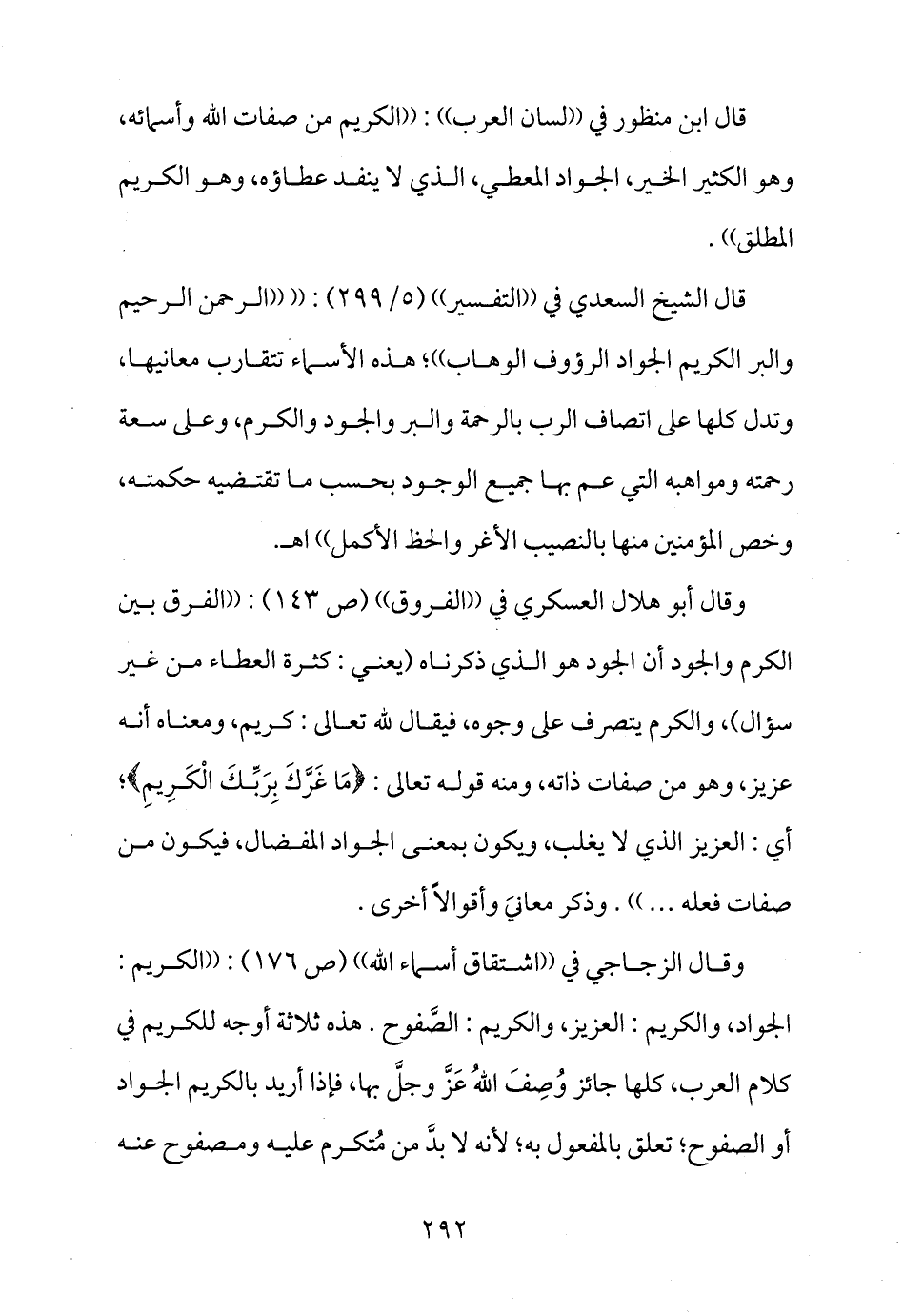 وقال الزجاجي في ((اشتقاق أسماء الله)) (ص 176) : ((الكريم: الجواد، والكريم: العزيز، والكريم: الصَّفوح. هذه ثلاثة أوجه للكريم في كلام العرب، كلها جائز وصف الله عَزَّ وجلَّ بها، فإذا أريد بالكريم الجواد أو الصفوح؛ تعلق بالمفعول به؛ لأنه لا بدَّ من مُتكرم عليه ومصفوح عنه