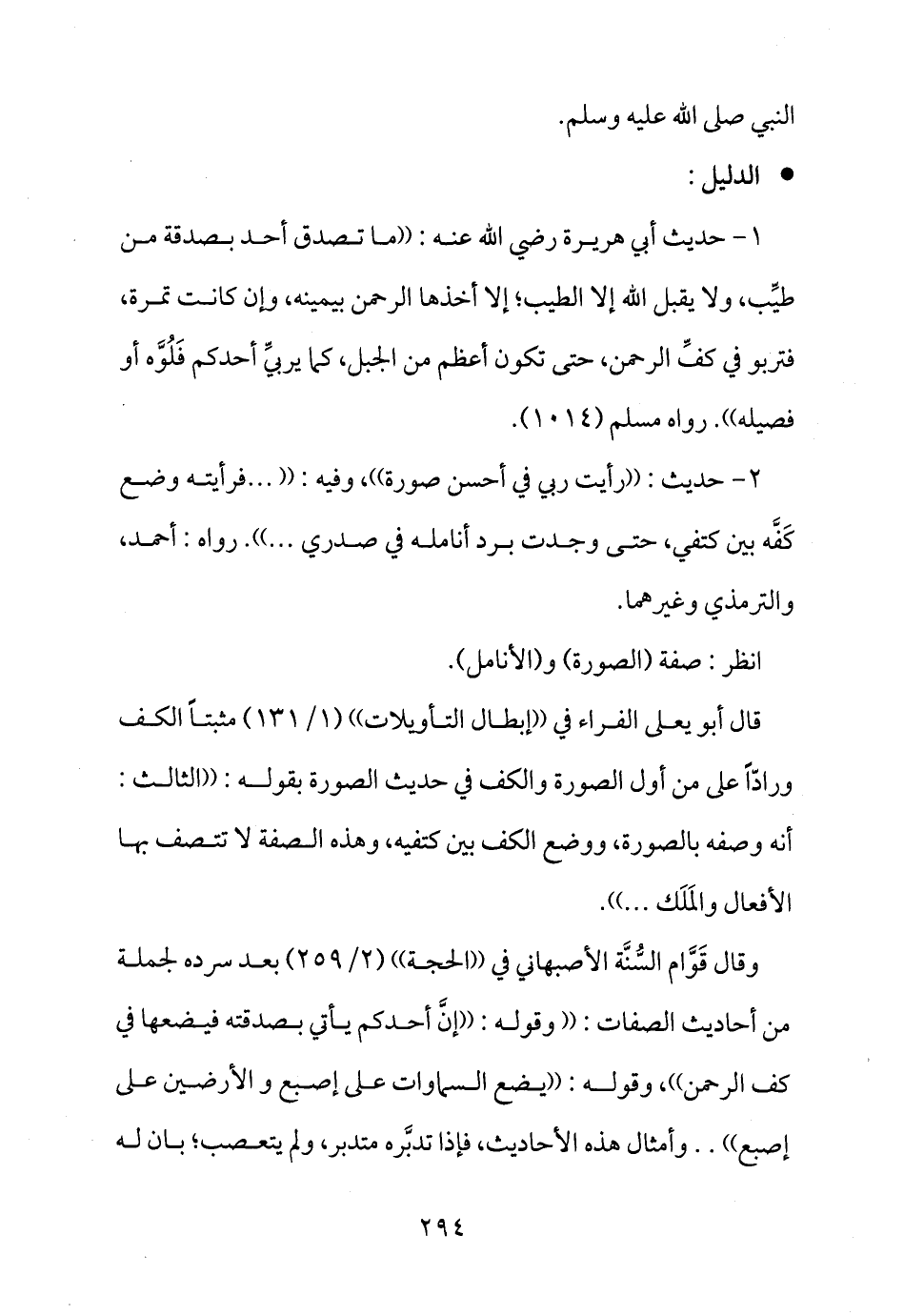 وقال قَوَّام السُّنَّة الأصبهاني في ((الحجة)) (2/259) بعد سرده لجملة من أحاديث الصفات: ((وقوله: ((إنَّ أحدكم يأتي بصدقته فيضعها في كف الرحمن)) ، وقوله: ((يضع السماوات على إصبع والأرضين على إصبع)) . . وأمثال هذه الأحاديث، فإذا تدبَّره متدبر، ولم يتعصب؛ بان له