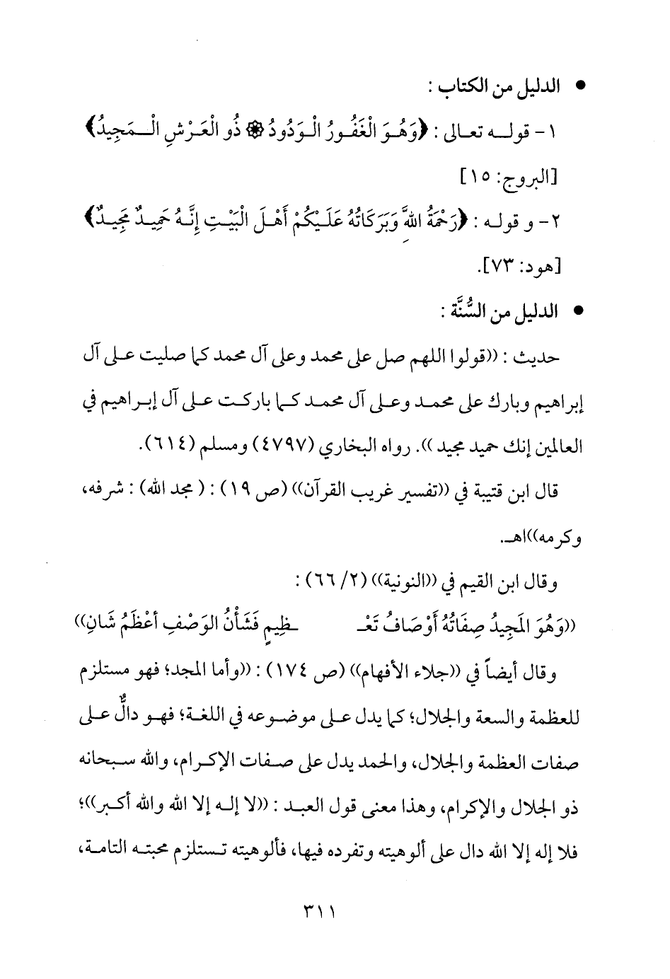 وقال أيضاً في ((جلاء الأفهام)) (ص 174) : ((وأما المجد؛ فهو مستلزم للعظمة والسعة والجلال؛ كما يدل على موضوعه في اللغة؛ فهو دالٌّ على صفات العظمة والجلال، والحمد يدل على صفات الإكرام، والله سبحانه ذو