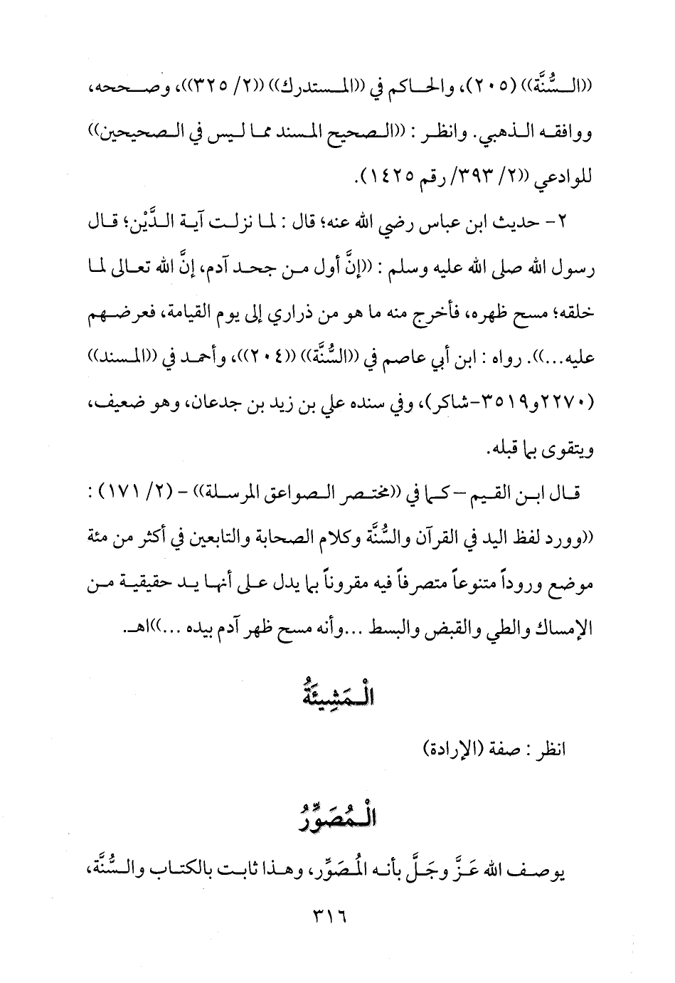 قال ابن القيم - كما في ((مختصر الصواعق المرسلة)) - (2/171) : ((وورد لفظ اليد في القرآن والسُّنَّة وكلام الصحابة والتابعين في أكثر من مئة موضع وروداً متنوعاً متصرفاً فيه مقروناً بما يدل على أنها يد حقيقية من الإمساك والطي والقبض والبسط ... وأنه مسح ظهر آدم بيده ... )) اهـ.