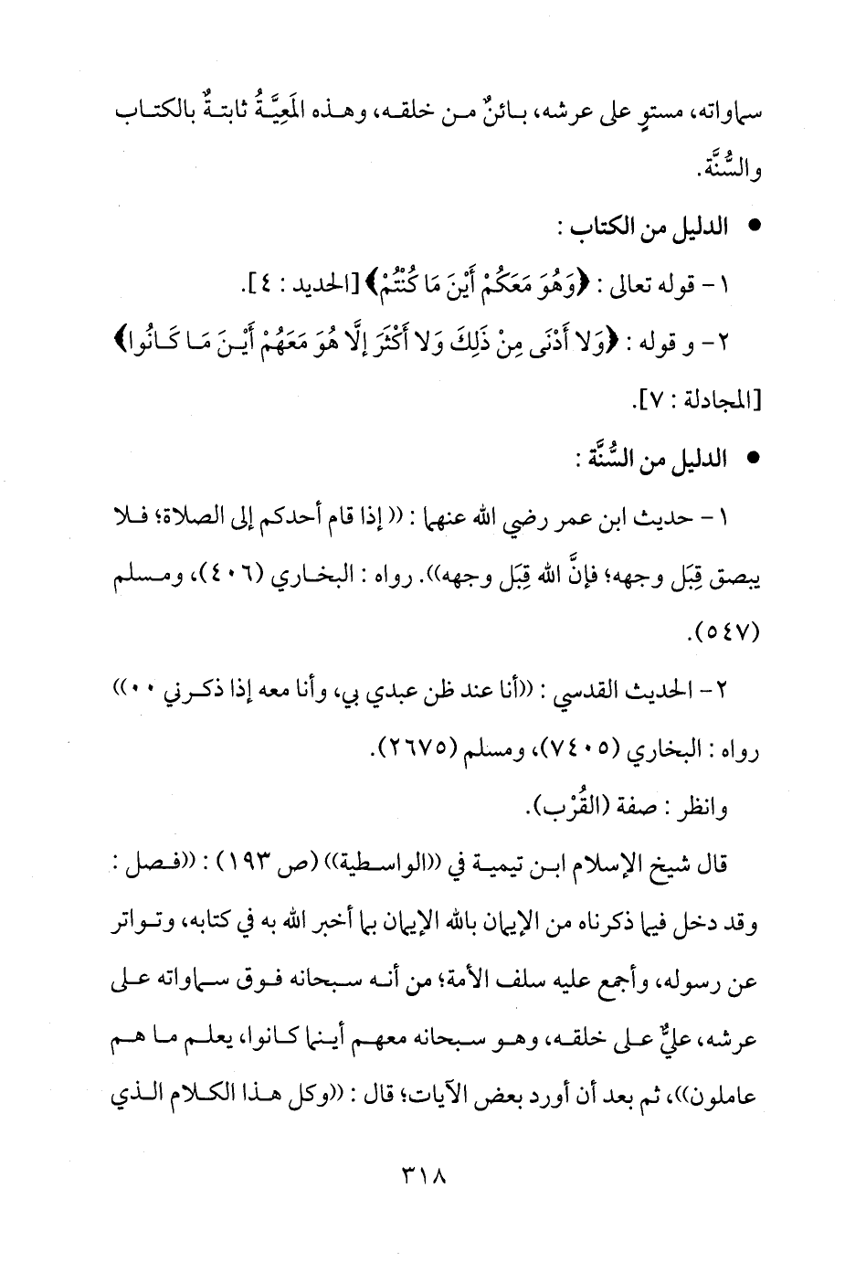 قال شيخ الإسلام ابن تيمية في ((الواسطية)) (ص 193) : ((فصل: وقد دخل فيما ذكرناه من الإيمان بالله الإيمان بما أخبر الله به في كتابه، وتواتر عن رسوله، وأجمع عليه سلف الأمة؛ من أنه سبحانه فوق سماواته على عرشه، عليُّ على خلقه، وهو سبحانه معهم أينما كانوا، يعلم ما هم عاملون)) ، ثم بعد أن أورد بعض الآيات؛ قال: ((وكل هذا الكلام الذي