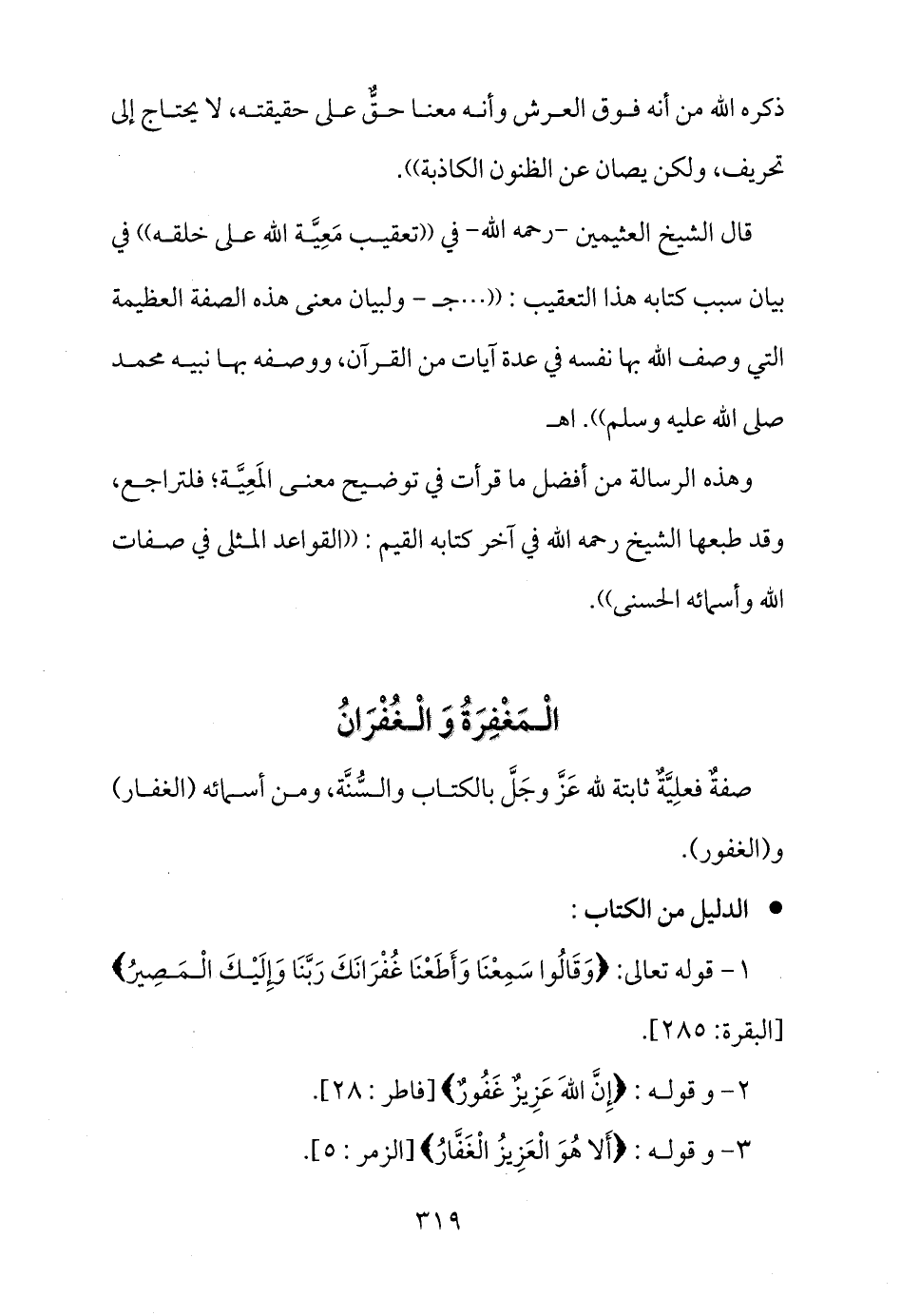 وهذه الرسالة من أفضل ما قرأت في توضيح معنى المَعِيَّة؛ فلتراجع، وقد طبعها الشيخ رحمه الله في آخر كتابه القيم: ((القواعد المثلى في صفات الله وأسمائه الحسنى)) .