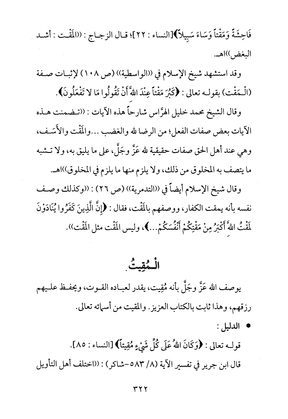 وقد استشهد شيخ الإسلام في ((الواسطية)) (ص 108) لإثبات صف (المَقْت) بقوله تعالى: {كَبُرَ مَقْتاً عِنْدَ اللَّهِ أَنْ تَقُولُوا مَا لا تَفْعَلُونَ} .