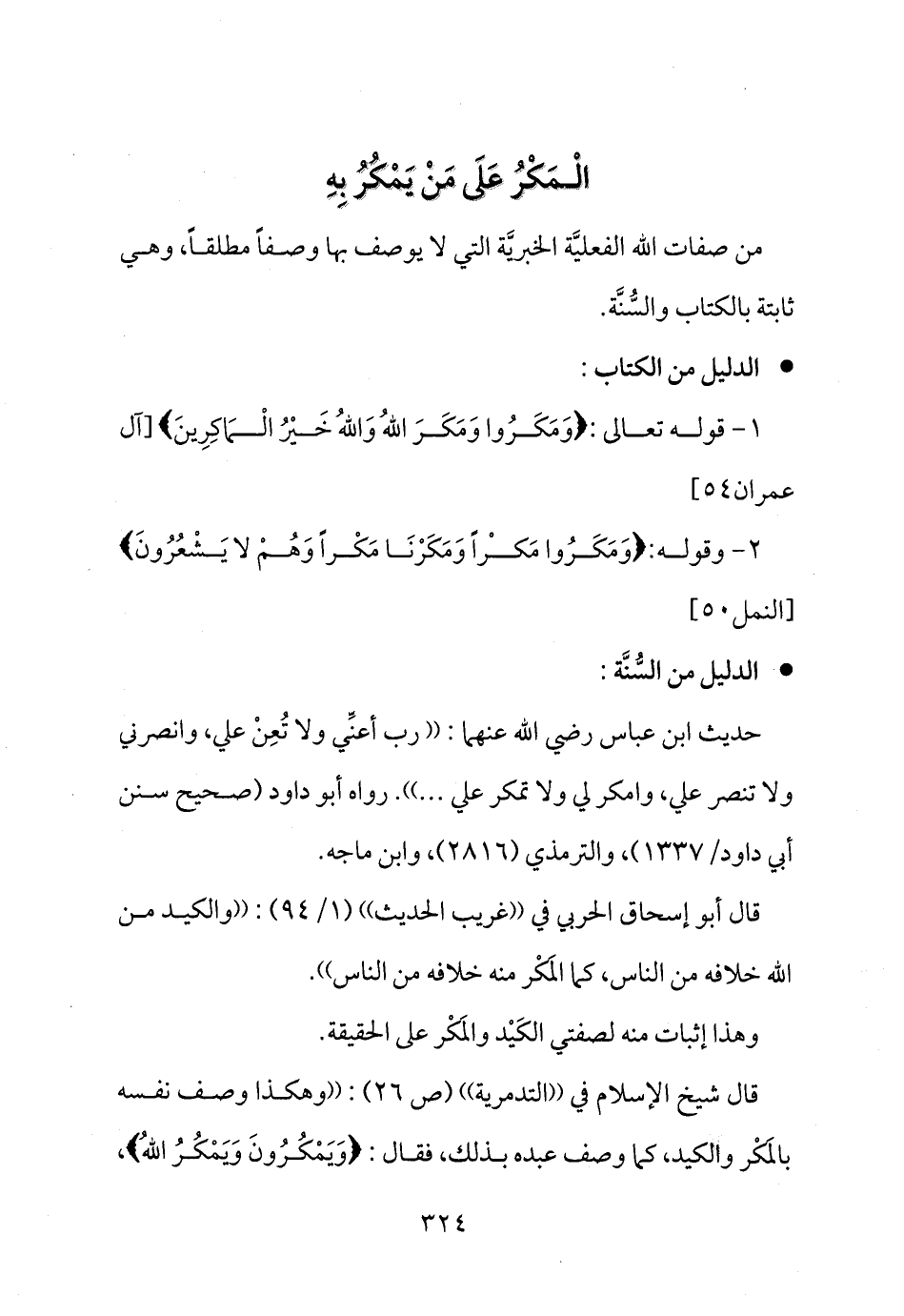 قال شيخ الإسلام في ((التدمرية)) (ص 26) : ((وهكذا وصف نفسه بالمَكْر والكيد، كما وصف عبده بذلك، فقال: {وَيَمْكُرُونَ وَيَمْكُرُ اللهُ} ،