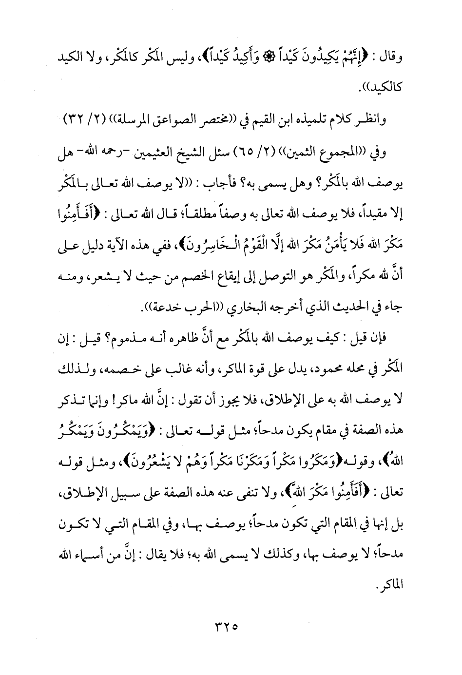 فإن قيل: كيف يوصف الله بالمَكْر مع أنَّ ظاهره أنه مذموم؟ قيل: إن المَكْر في محله محمود، يدل على قوة الماكر، وأنه غالب على خصمه، ولذلك لا يوصف الله به على الإطلاق، فلا يجوز أن تقول: إنَّ الله ماكر! وإنما تذكر هذه الصفة في مقام يكون مدحاً؛ مثل قوله تعالى: {وَيَمْكُرُونَ وَيَمْكُرُ اللهُ} ، وقوله {وَمَكَرُوا مَكْراً وَمَكَرْنَا مَكْراً وَهُمْ لا يَشْعُرُونَ} ، ومثل قوله تعالى: {أَفَأَمِنُوا مَكْرَ اللَّهِ} ، ولا تنفى عنه هذه الصفة على سبيل الإطلاق، بل إنها في المقام التي تكون مدحاً؛ يوصف بها، وفي المقام التي لا تكون مدحاً؛ لا يوصف بها، وكذلك لا يسمى الله به؛ فلا يقال: إنَّ من أسماء الله الماكر.