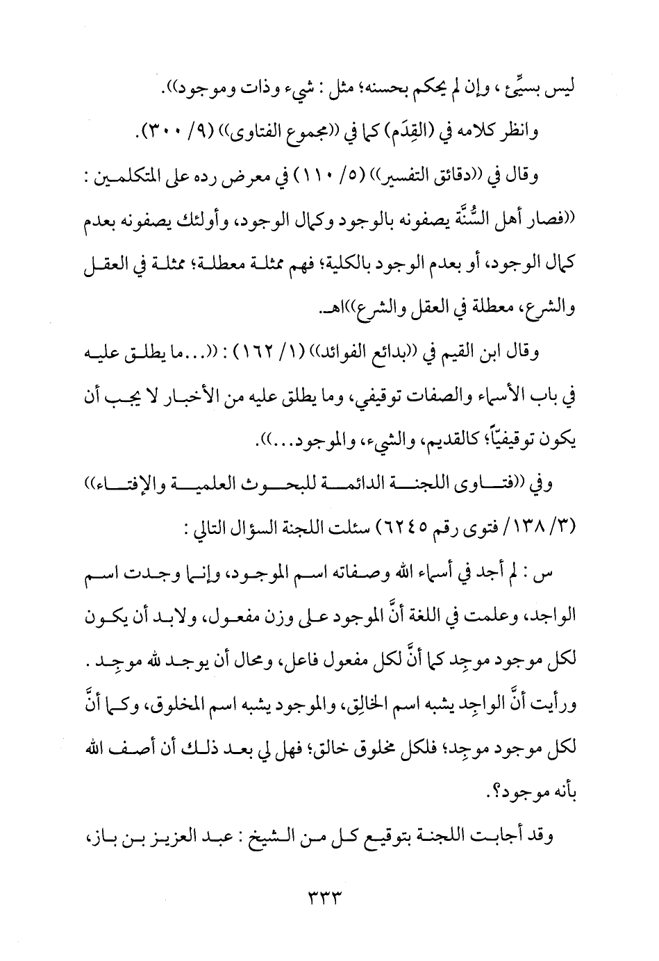 وقال ابن القيم في ((بدائع الفوائد)) (1/162) : (( ... ما يطلق عليه في باب الأسماء والصفات توقيفي، وما يطلق عليه من الأخبار لا يجب أن يكون توقيفيّاً؛ كالقديم، والشيء، والموجود ... )) .