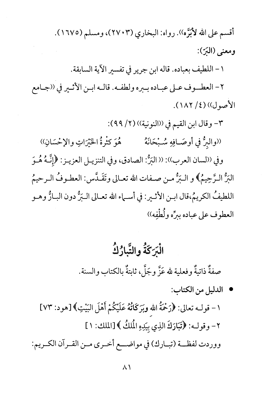 ((والبِِرُّ في أوصَافِهِ سُبْحَانَهُ ... هُوَ كثْرةُ الخَيراتِ والإحْسَانِ))