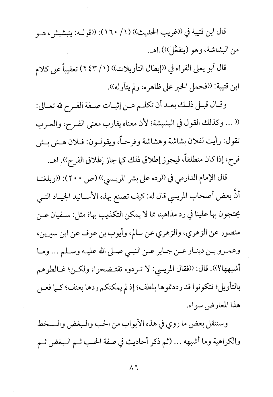 وقال قبل ذلك بعد أن تكلم عن إثبات صفة الفرح لله تعالى: (( ... وكذلك القول في البشبشة؛ لأن معناه يقارب معنى الفرح، والعرب تقول: رأيت لفلان بشاشة وهشاشة وفرحاً، ويقولون: فلان هش بش فرح، إذا كان منطلقاً، فيجوز إطلاق ذلك كما جاز إطلاق الفرح)) . اهـ.