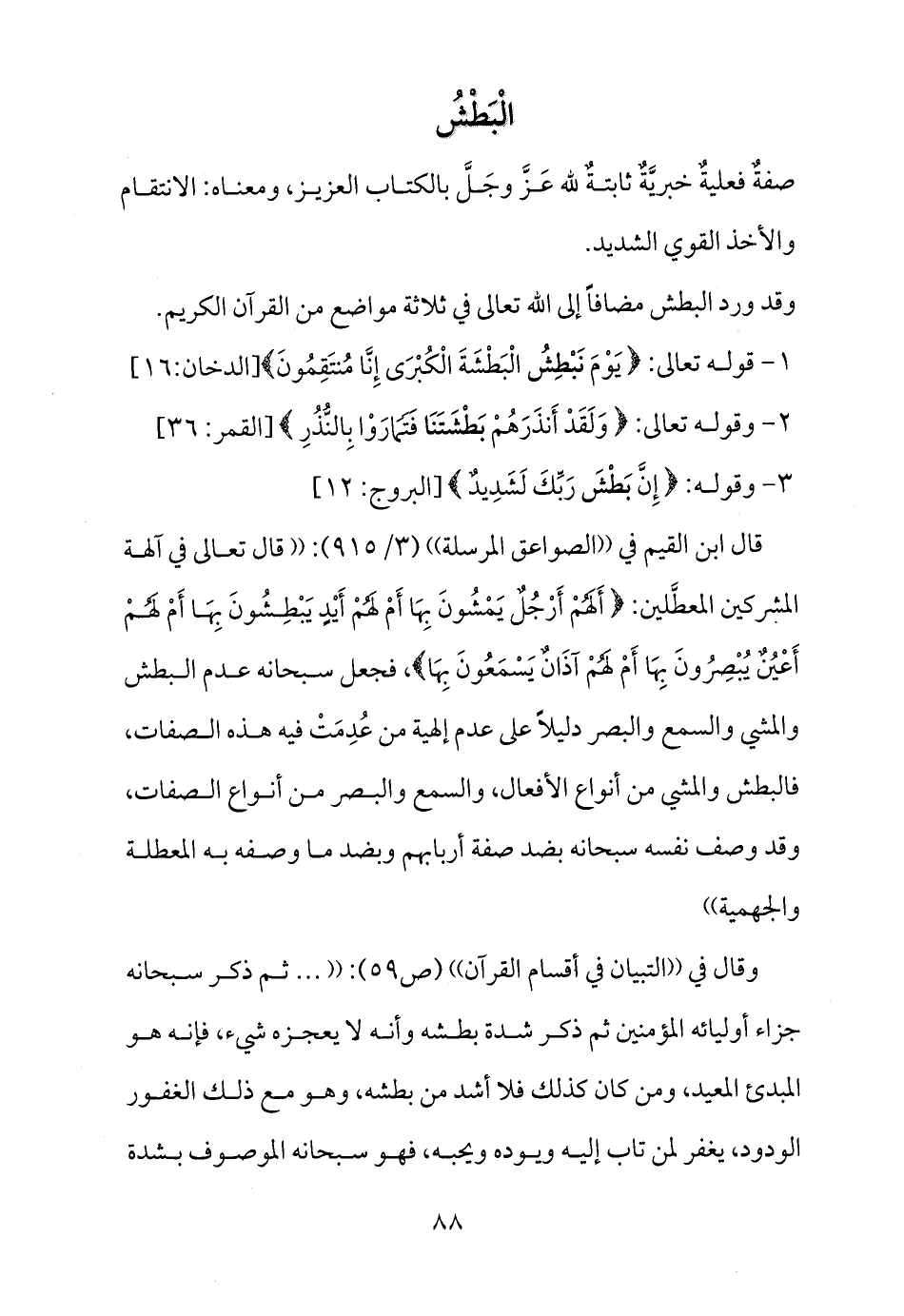 قال ابن القيم في ((الصواعق المرسلة)) (3/915) : ((قال تعالى في آلهة المشركين المعطلين {أَلَهُمْ أَرْجُلٌ يَمْشُونَ بِهَا أَمْ لَهُمْ أَيْدٍ يَبْطِشُونَ بِهَا أَمْ لَهُمْ أَعْيُنٌ يُبْصِرُونَ بِهَا أَمْ لَهُمْ آذَانٌ يَسْمَعُونَ بِهَا} ، فجعل سبحانه عدم البطش والمشي والسمع والبصر دليلا على عدم إلهية من عُدمت فيه هذه الصفات، فالبطش والمشي من أنواع الأفعال، والسمع والبصر من أنواع الصفات، وقد وصف نفسه سبحانه بضد صفة أربابهم وبضد ما وصفه به المعطلة والجهمية))