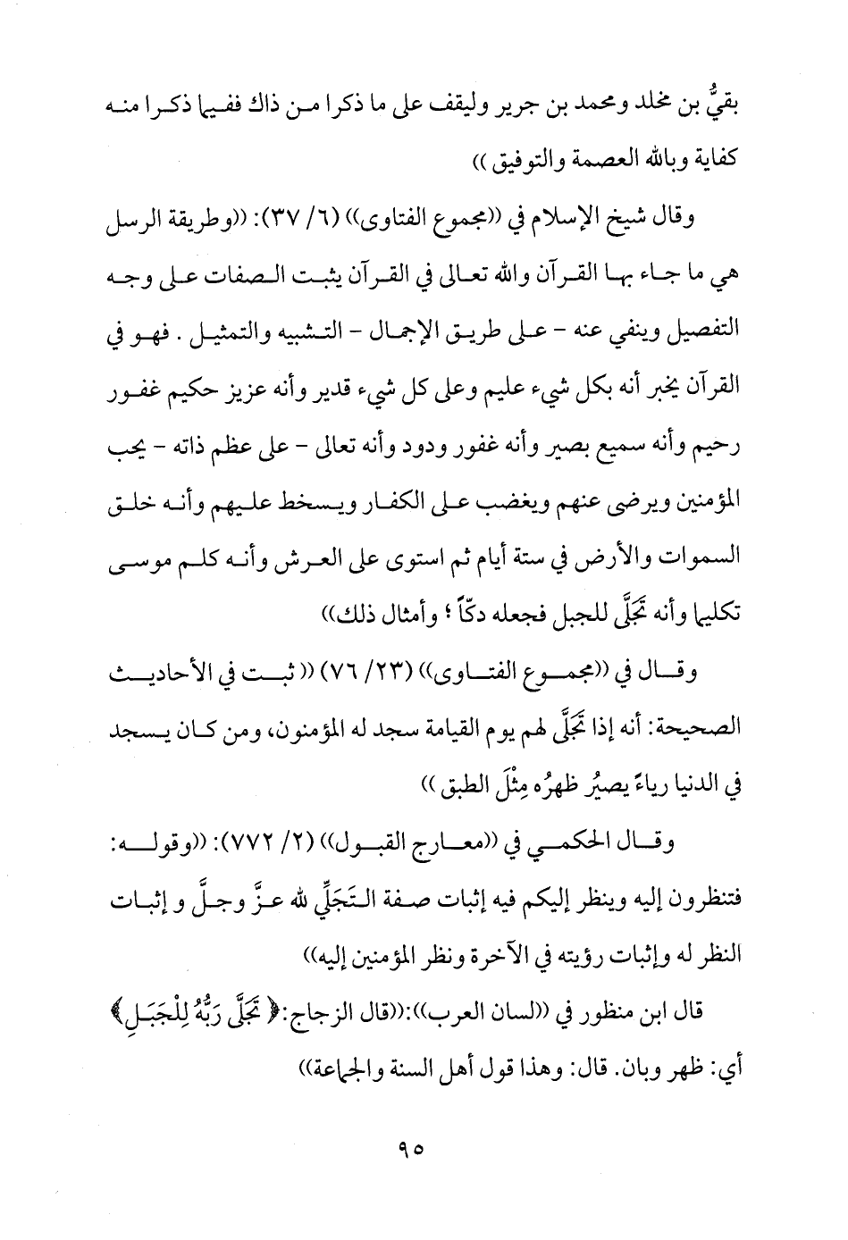 وقال شيخ الإسلام في ((مجموع الفتاوى)) (6/37) : ((وطريقة الرسل هي ما جاء بها القرآن والله تعالى في القرآن يثبت الصفات على وجه التفصيل وينفي عنه - على طريق الإجمال - التشبيه والتمثيل. فهو في القرآن يخبر أنه بكل شيء عليم وعلى كل شيء قدير وأنه عزيز حكيم غفور رحيم وأنه سميع بصير وأنه غفور ودود وأنه تعالى - على عظم ذاته - يحب المؤمنين ويرضى عنهم ويغضب على الكفار ويسخط عليهم وأنه خلق السموات والأرض في ستة أيام ثم استوى على العرش وأنه كلم موسى تكليما وأنه تَجَلَّى للجبل فجعله دكاً ; وأمثال ذلك))