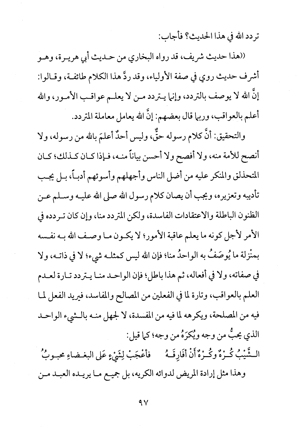 والتحقيق: أنَّ كلام رسوله حق، وليس أحد أعلم بالله من رسوله، ولا أنصح للأمة منه، ولا أفصح ولا أحسن بياناً منه، فإذا كان كذلك؛ كان المتحذلق والمنكر عليه من أضل الناس وأجهلهم وأسوئهم أدباً، بل يجب تأديبه وتعزيره، ويجب أن يصان كلام رسول الله صلى الله عليه وسلم عن الظنون الباطلة والاعتقادات الفاسدة، ولكن المتردد منا، وإن كان تردده في الأمر لأجل كونه ما يعلم عاقبة الأمور؛ لا يكون ما وصف الله به نفسه بمنْزلة ما يوصف به الواحد منا؛ فإن الله ليس كمثله شيء؛ لا في ذاته، ولا في صفاته، ولا في أفعاله، ثم هذا باطل؛ فإن الواحد منا يتردد تارة لعدم العلم بالعواقب، وتارة لما في الفعلين من المصالح والمفاسد، فيريد الفعل لما فيه من المصلحة، ويكرهه لما فيه من المفسدة، لا لجهل منه بالشيء الواحد الذي يحب من وجه ويكره من وجه؛ كما قيل: