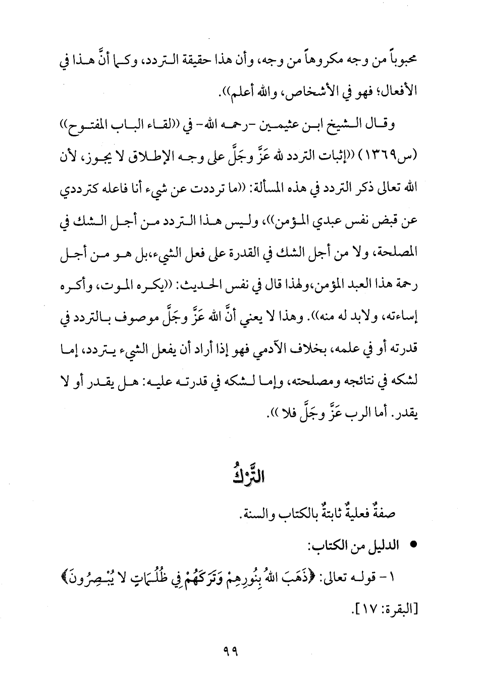 وقال الشيخ ابن عثيمين -رحمه الله- في ((لقاء الباب المفتوح)) (س1369) ((إثبات التردد لله عَزَّ وجَلَّ على وجه الإطلاق لا يجوز، لأن الله تعالى ذكر التردد في هذه المسألة: ((ما ترددت عن شيء أنا فاعله كترددي عن قبض نفس عبدي المؤمن)) ، وليس هذا التردد من أجل الشك في المصلحة، ولا من أجل الشك في القدرة على فعل الشيء، بل هو من أجل رحمة هذا العبد المؤمن، ولهذا قال في نفس الحديث: ((يكره الموت، وأكره إساءته، ولابد له منه)) . وهذا لا يعني أنَّ الله عَزَّ وجَلَّ موصوف بالتردد في قدرته أو في علمه، بخلاف الآدمي فهو إذا أراد أن يفعل الشيء يتردد، إما لشكه في نتائجه ومصلحته، وإما لشكه في قدرته عليه: هل يقدر أو لا يقدر. أما الرب عَزَّ وجَلَّ فلا)) .