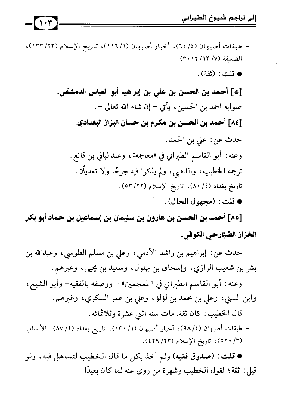 [85] أحمد بن الحسن بن هارون بن سليمان بن إسماعيل بن حماد أبو بكر الخزاز الصبارحي الكوفي.