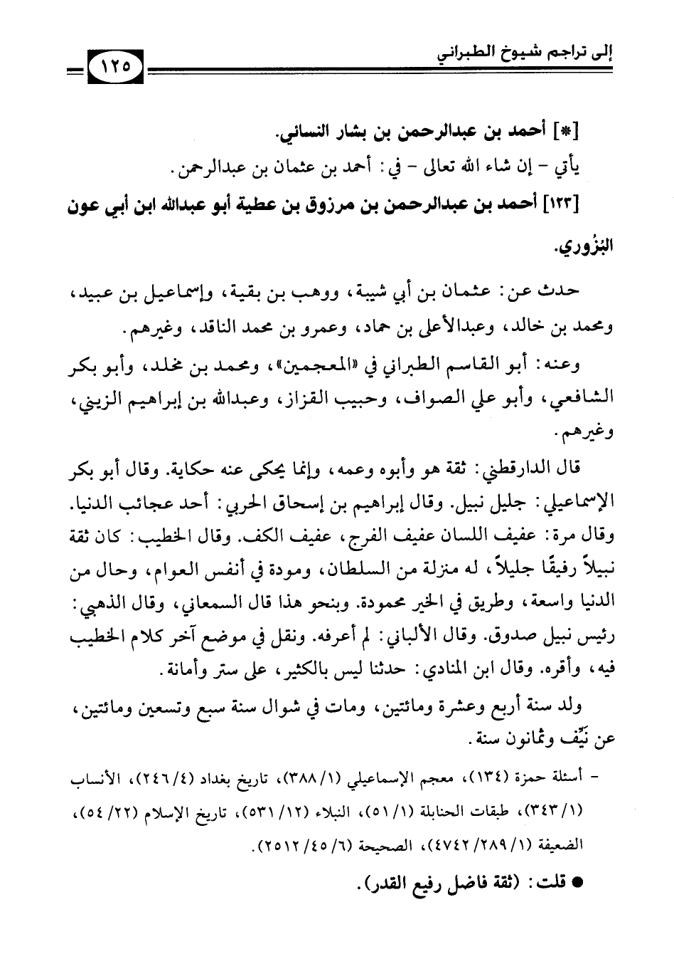 - أسئلة حمزة (134)، معجم الإسماعيلي (1/ 388)، تاريخ بغداد (4/ 246)، الأنساب (1/ 343)، طبقات الحنابلة (1/ 51)، النبلاء (12/ 531)، تاريخ الإسلام (22/ 54)، الضعيفة (1/ 289/ 4742)، الصحيحة (6/ 45/ 2512).