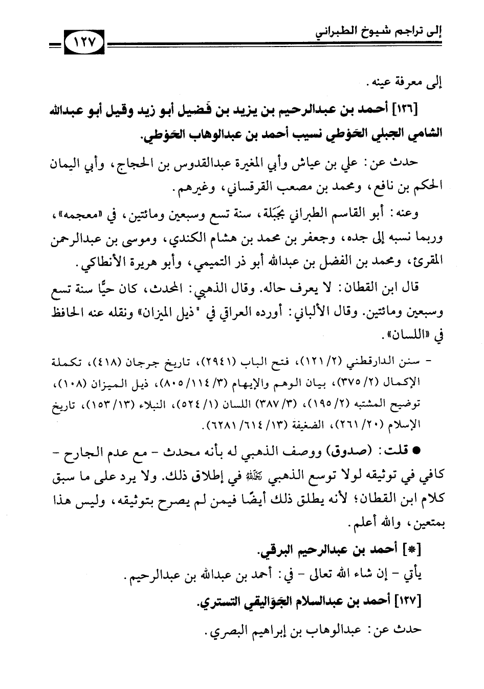 [126] أحمد بن عبد الرحيم بن يزيد بن فضيل أبو زيد وقيل أبو عبد الله الشامي الجبلي الحوطي نسيب أحمد بن عبد الوهاب الحوطي.