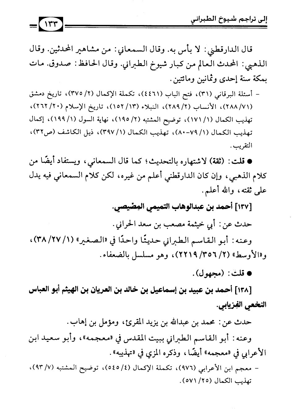 - أسئلة البرقاني (31)، فتح الباب (4461)، تكملة الإكمال (2/ 375)، تاريخ دمشق (71/ 288)، الأنساب (2/ 289)، النبلاء (13/ 152)، تاريخ الإسلام 20/ 262)، تهذيب الكمال (1/ 171)، توضيح المشتبه (2/ 195)، نهاية السول (1/ 199)، إكمال تهذيب الكمال (1/ 79 - 80)، تهذيب الكمال (1/ 397)، ذيل الكاشف (ص 32)، التقريب.
