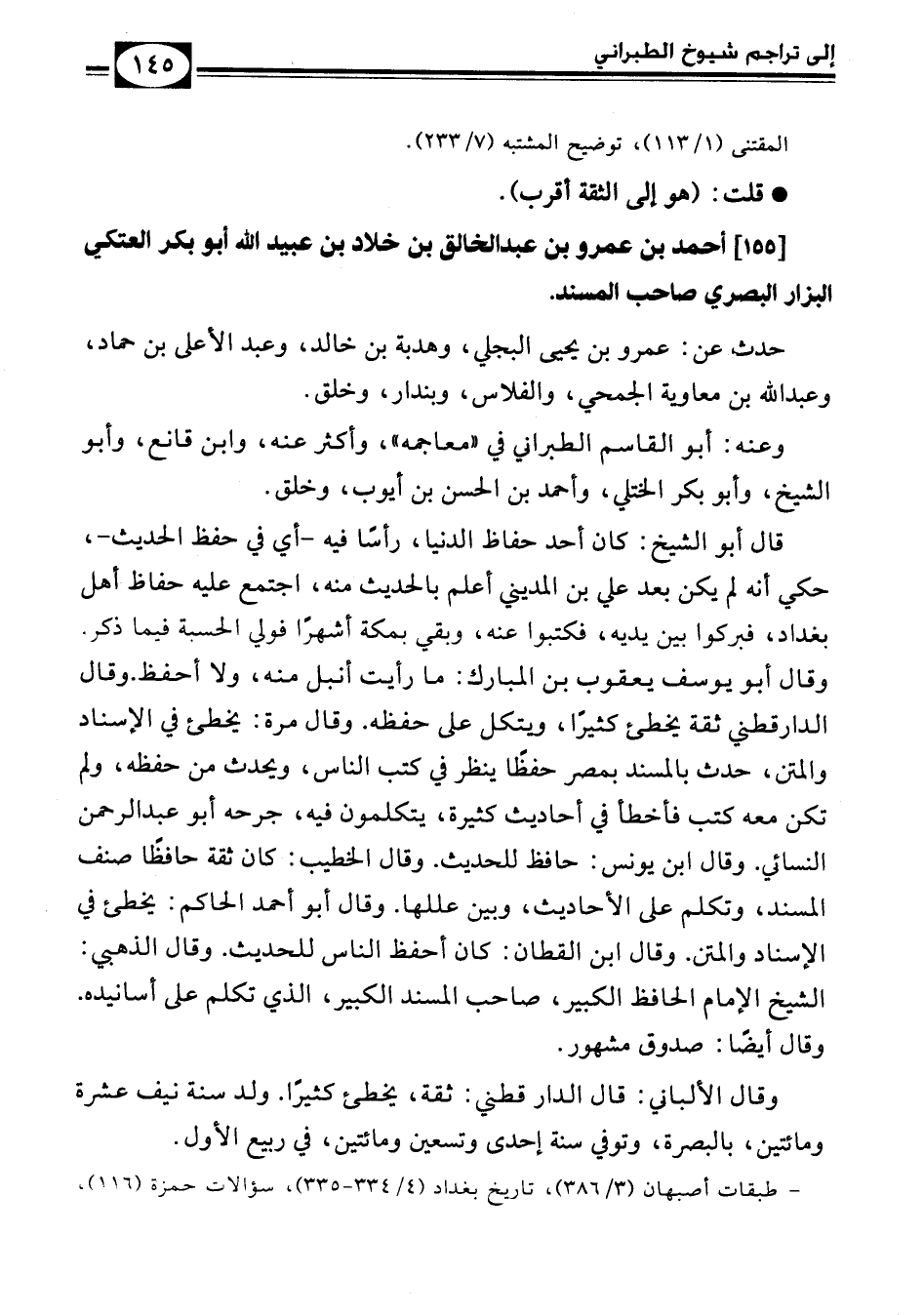 [155] أحمد بن عمرو بن عبد الخالق بن خلاد بن عبيد الله أبو بكر العتكي البزار البصري صاحب المسند.