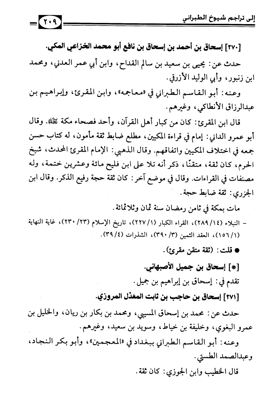 - النبلاء (14/ 289)، القراء الكبار (1/ 227)، تاريخ الإسلام (23/ 230)، غاية النهاية (1/ 156)، العقد الثمين (3/ 390)، الشذرات (4/ 39).