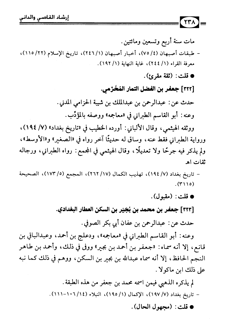 ووثقه الهيثمي، وقال الألباني: أورده الخطيب في " تاريخ بغداد " (7/ 194)، ورواية الطبراني فقط عنه، وساق له حديثًا آخر رواه في " الصغير " و" الأوسط " ولم يذكر فيه جرحًا ولا تعديلًا، وقال الهيثمي في المجمع: رواه الطبراني، ورجاله ثقات، اهـ.