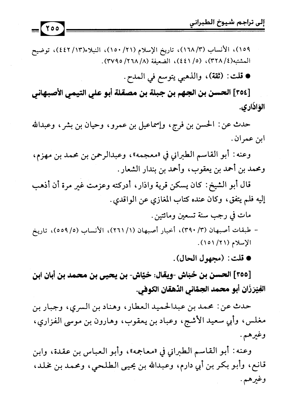 159 -)، الأنساب (3/ 168)، تاريخ الإسلام (21/ 150)، النبلاء (13/ 442)، توضيح المشتبه (4/ 328)، (5/ 441)، الضعيفة (8/ 268 / 3795).