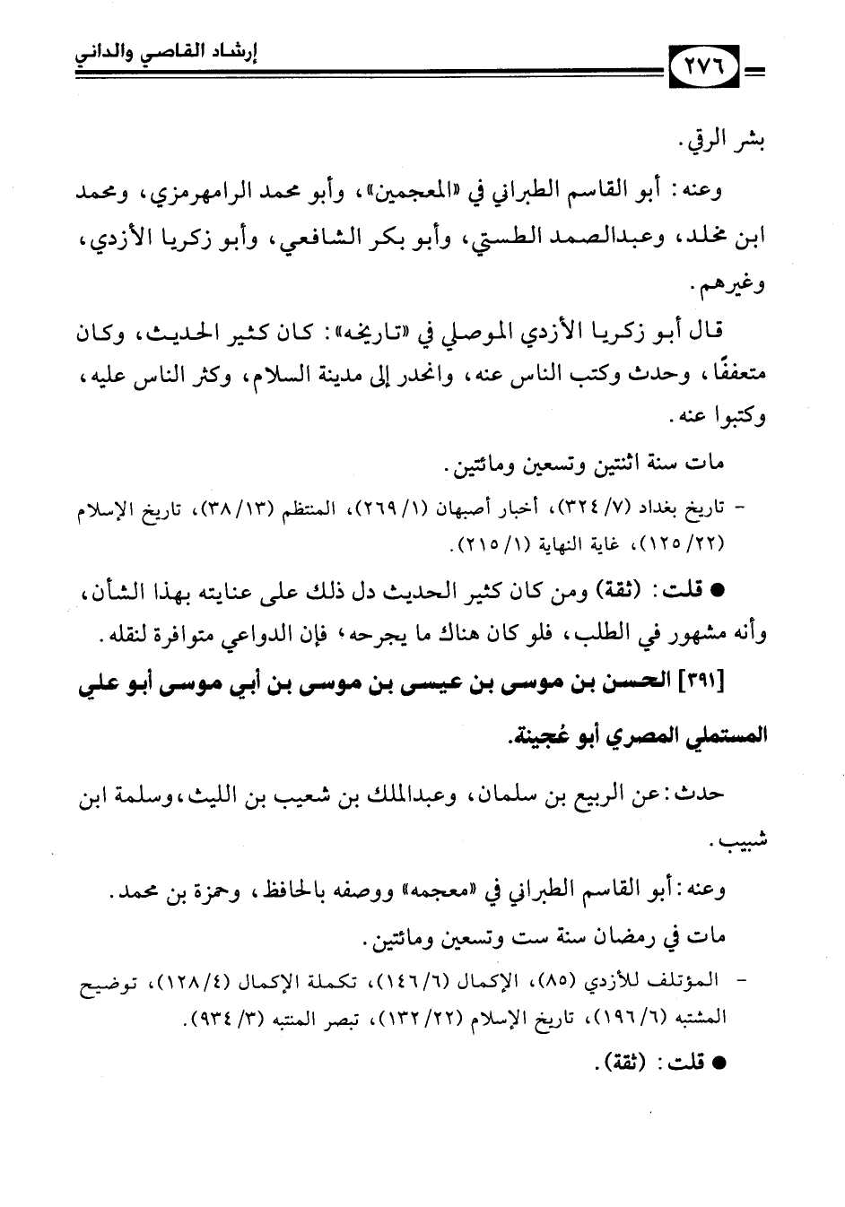 - تاريخ بغداد (7/ 324)، أخبار أصبهان (1/ 269)، المنتظم (13/ 38)، تاريخ الإسلام (22/ 125)، غاية النهاية (1/ 215).