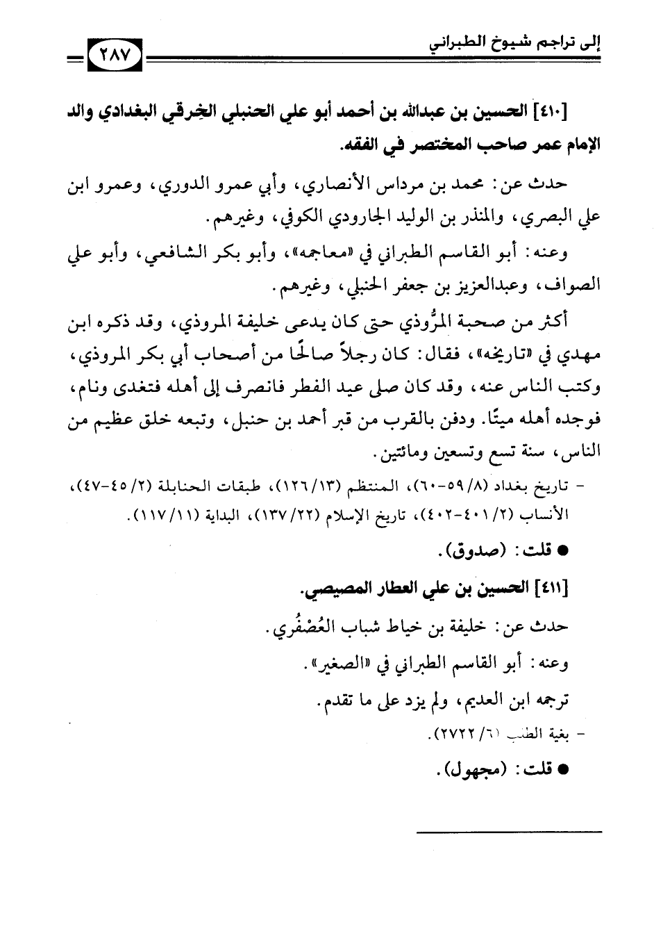 [410] الحسين بن عبد الله بن أحمد أبو علي الحنبلي الخِرقي البغدادي والد الإمام عمر صاحب المختصر في الفقه.
