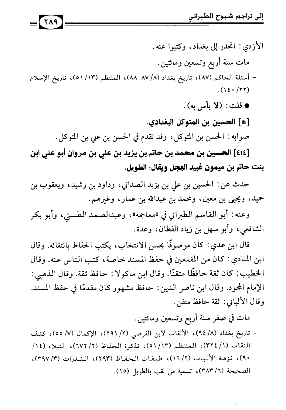 - تاريخ بغداد (8/ 94)، الألقاب لابن الفرضي (2/ 291)، الإكمال (7/ 55)، كشف النقاب (1/ 324)، المنتظم (13/ 51)، تذكرة الحفاظ (2/ 672)، النبلاء (14/ 90)، نزهة الألباب (2/ 16)، طبقات الحفاظ (293)، الشذرات (3/ 397)، الصحيحة (6/ 383)، تسمية من لقب بالطويل (15).