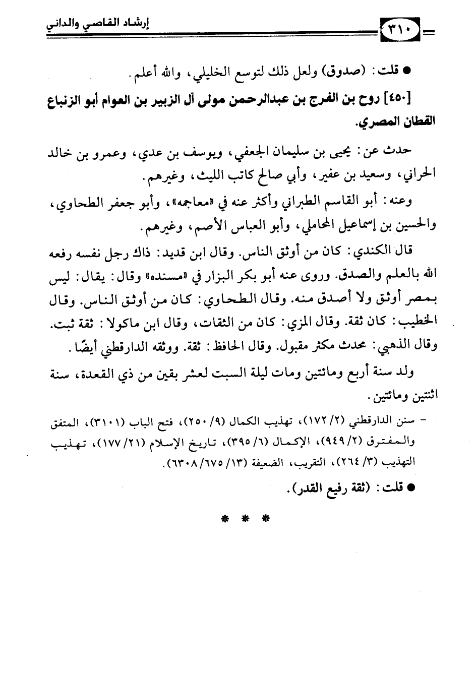 - سنن الدارقطني (2/ 172)، تهذيب الكمال (9/ 250)، فتح الباب (3101)، المتفق والمفترق (2/ 949)، الإكمال (6/ 395)، تاريخ الإسلام (21/ 177)، تهذيب التهذيب (3/ 264)، التقريب، الضعيفة (13/ 675/ 6308).