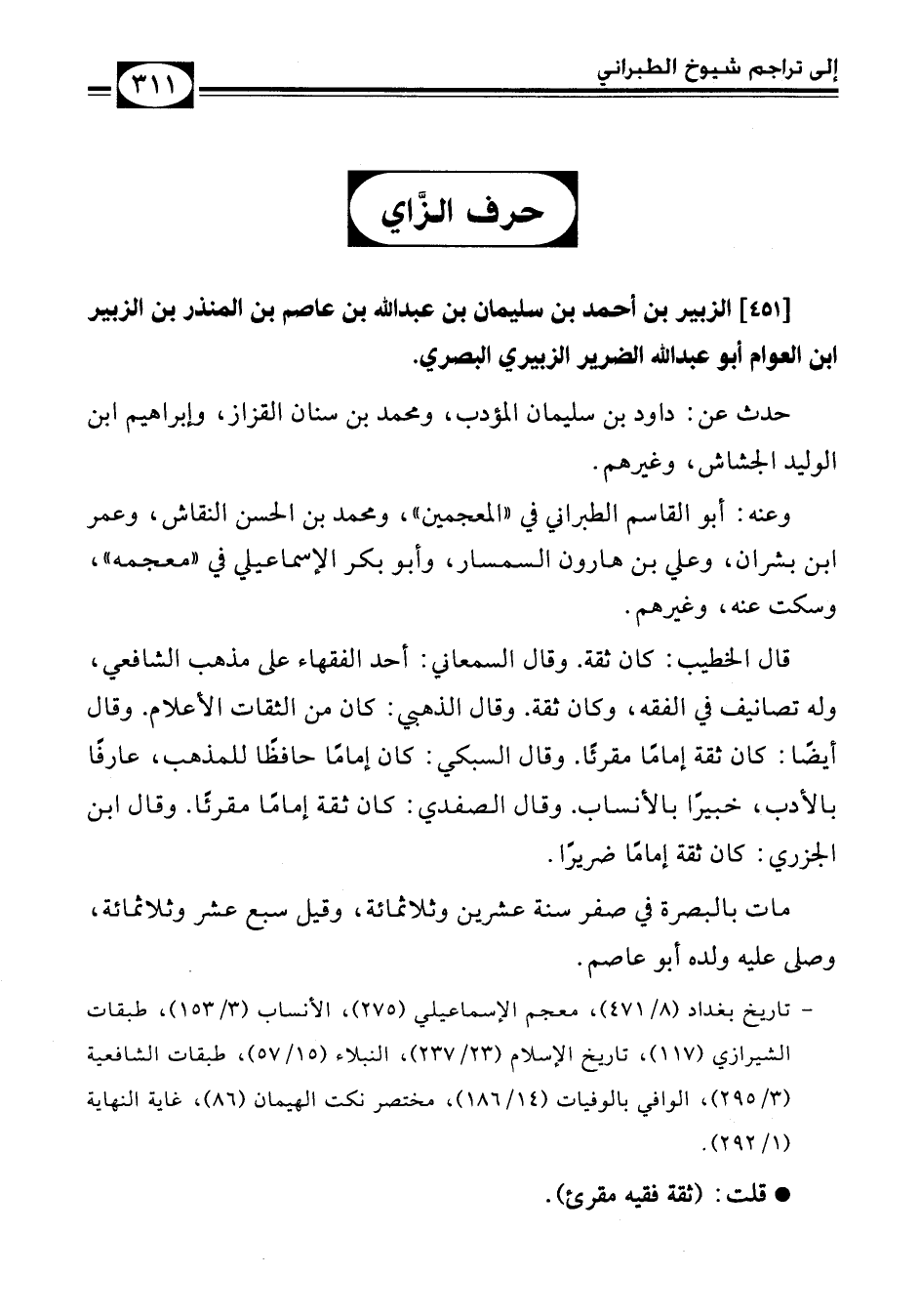 - تاريخ بغداد (8/ 471)، معجم الإسماعيلي (275)، الأنساب (3/ 153)، طبقات الشيرازي (117)، تاريخ الإسلام (23/ 237)، النبلاء (15/ 57)، طبقات الشافعية (3/ 295)، الوافي بالوفيات (14/ 186)، مختصر نكت الهيمان (86)، غاية النهاية (1/ 292).