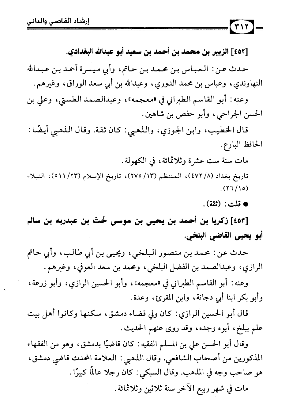 - تاريخ بغداد (8/ 472)، المنتظم (13/ 275)، تاريخ الإسلام (23/ 511)، النبلاء (15/ 26).