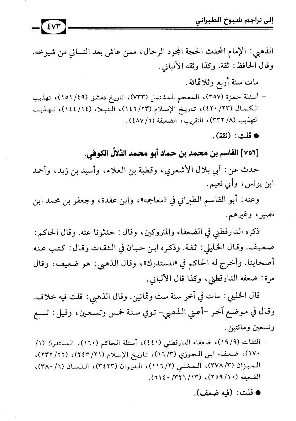 - أسئلة حمزة (357)، المعجم المشتمل (733)، تاريخ دمشق (49/ 151)، تهذيب الكمال (23/ 420)، تاريخ الإسلام (23/ 146)، النبلاء (14/ 144)، تهذيب التذهيب (8/ 332)، التقريب، الضعيفة (6/ 487).