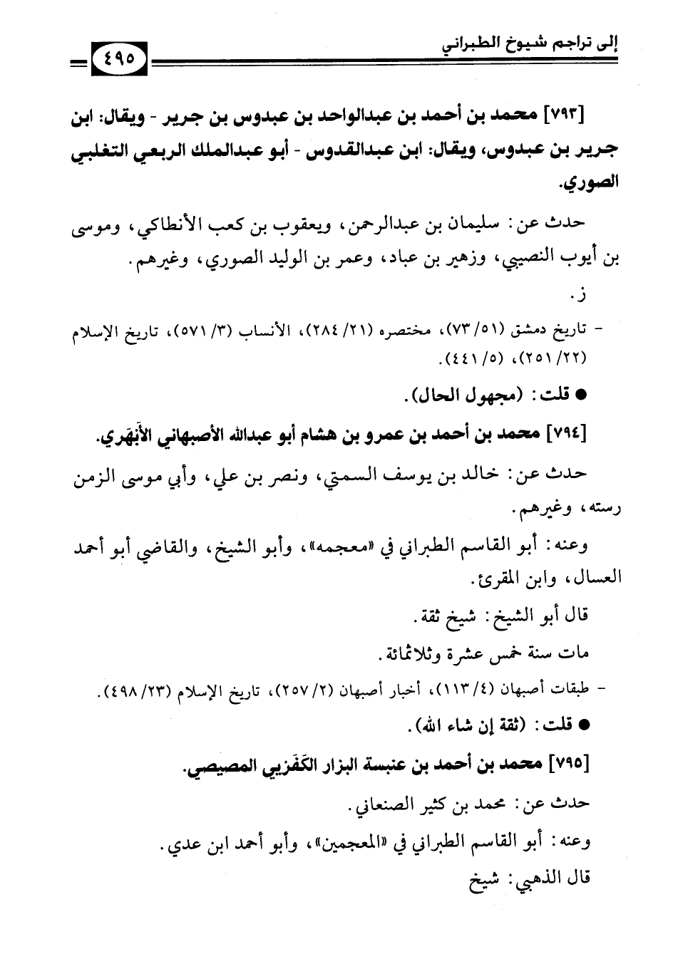 [793] محمد بن أحمد بن عبد الواحد بن عبدوس بن جرير – ويقال: ابن جرير بن عبدوس، ويقال: ابن عبد القدوس – أبو عبد الملك الربعي التغلبي الصوري.