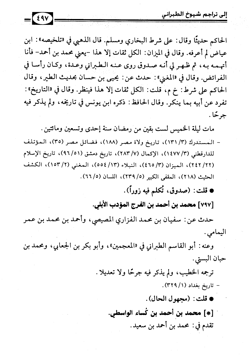 الحاكم حديثاً وقال: على شرط البخاري ومسلم. قال الذهبي في " تلخيصه ": ابن عياض لم أعرفه. وقال في الميزان: الكل ثقات إلا هذا - يعني محمد بن أحمد – فأنا أتهمه به، ثم ظهر لي أنه صدوق روى عنه الطبراني وعدة، وكان رأسا في الفرائض. وقال في " المغني ": حدث عن: يحيى بن حسان بحديث الطير ‘وقال الحاكم على شرط: خ م، قلت: الكل ثقات إلا هذا فينظر. وقال في " التاريخ ": تفرد عن أبيه بما ينكر. وقال الحافظ: ذكره ابن يونس في تاريخه، ولم يذكر فيه جرحا.