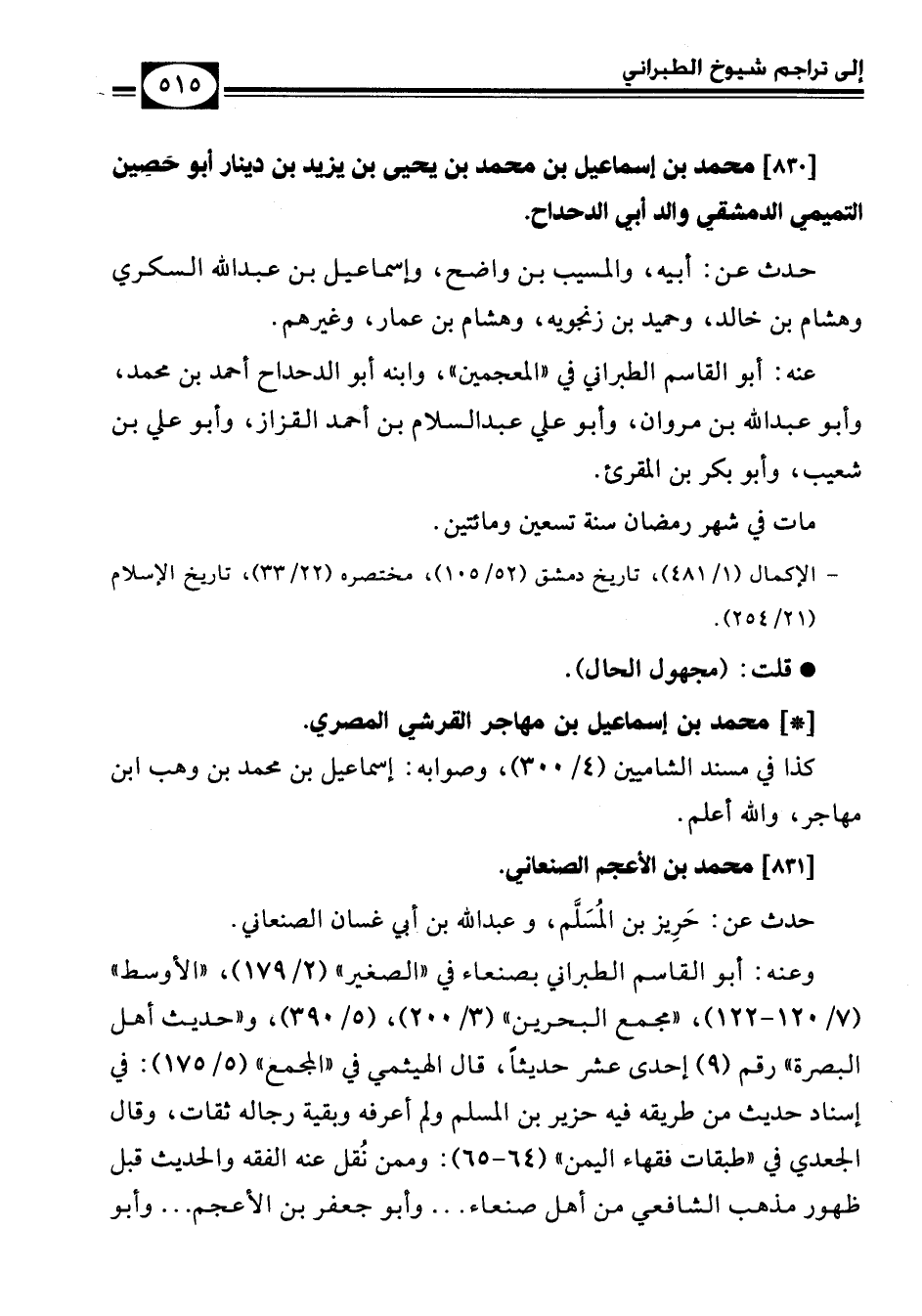 [830] محمد بن إسماعيل بن محمد بن يحيى بن يزيد بن دينار أبو حَصين التميمي الدمشقي والد أبي الدحداح.