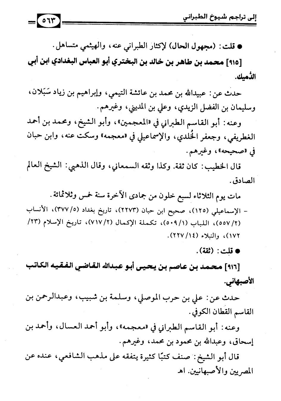 - الإسماعيلي (125)، صحيح ابن حبان (2273)، تاريخ بغداد (5/ 377)، الأنساب (2/ 557)، اللباب (1/ 509)، تكملة الإكمال (2/ 717)، تاريخ الإسلام (23/ 172)، والنبلاء (14/ 227).