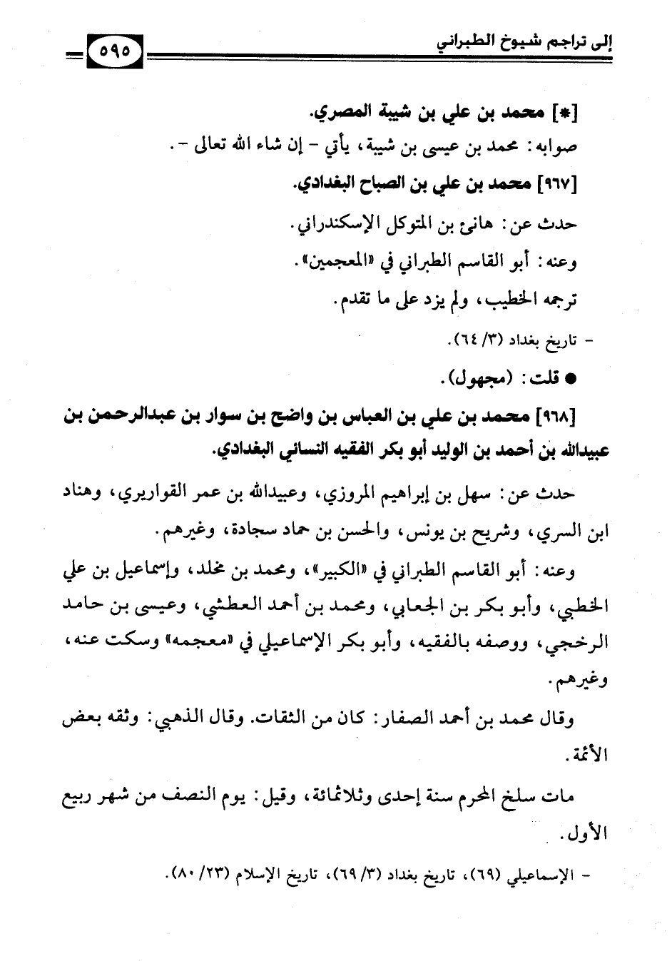 - الإسماعيلي (69)، تاريخ بغداد (3/ 69)، تاريخ الإسلام (23/ 80).