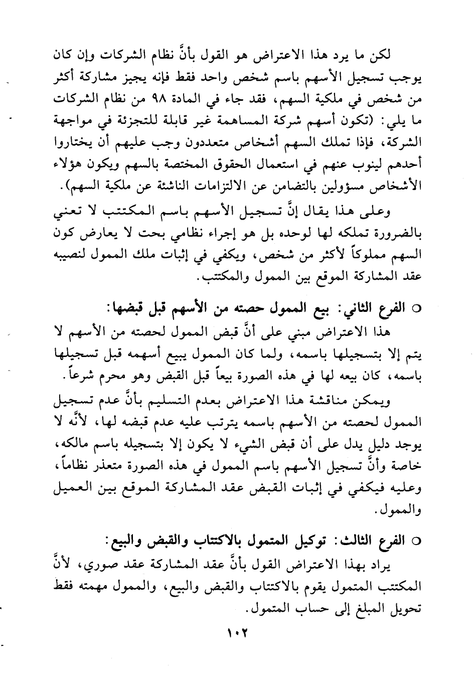 لكن ما يرد هذا الاعتراض هو القول بأن نظام الشركات وإن كان يوجب تسجيل الأسهم باسم شخص واحد فقط فإنه يجيز مشاركة أكثر من شخص في ملكية السهم، فقد جاء في المادة 98 من نظام الشركات ما يلي: (تكون أسهم شركة المساهمة غير قابلة للتجزئة في مواجهة الشركة، فإذا تملك السهم أشخاص متعددون وجب عليهم أن يختاروا أحدهم لينوب عنهم في استعمال الحقوق المختصة بالسهم ويكون هؤلاء الأشخاص مسؤولين بالتضامن عن الالتزامات الناشئة عن ملكية السهم).