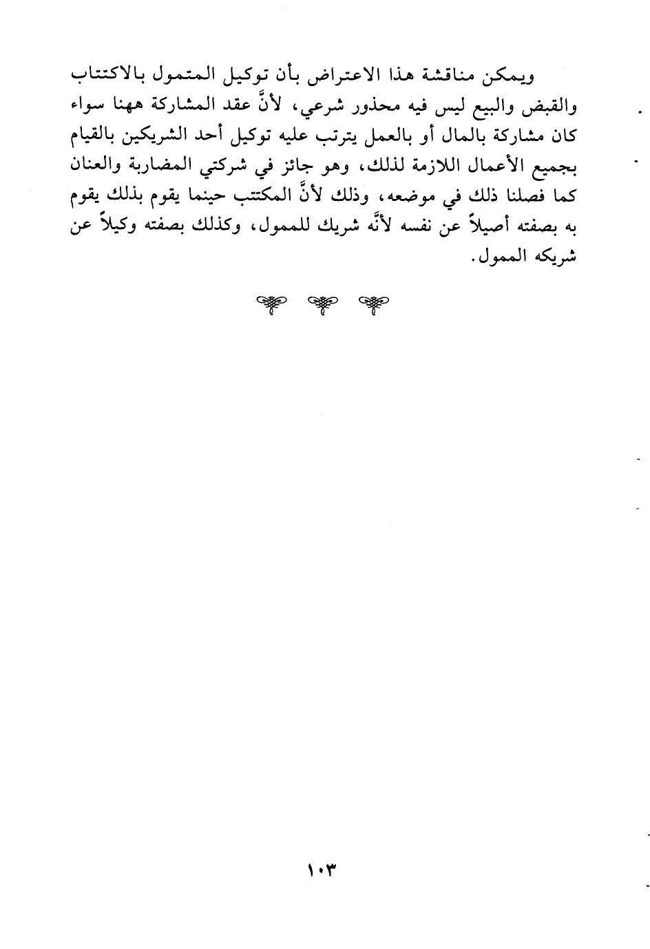 ويمكن مناقشة هذا الاعتراض بأن توكيل المتمول بالاكتتاب والقبض والبيع ليس فيه محذور شرعي، لأن عقد المشاركة هنا سواء كان مشاركة بالمال أو بالعمل يترتب عليه توكيل أحد الشريكين بالقيام بجميع الأعمال اللازمة لذلك، وهو جائز في شركتي المضاربة والعنان كما فصلنا ذلك في موضعه، وذلك لأن المكتتب حينما يقوم بذلك يقوم به بصفته أصيلا عن نفسه لأنه شريك للممول، وكذلك بصفته وكيلا عن شريكه الممول.