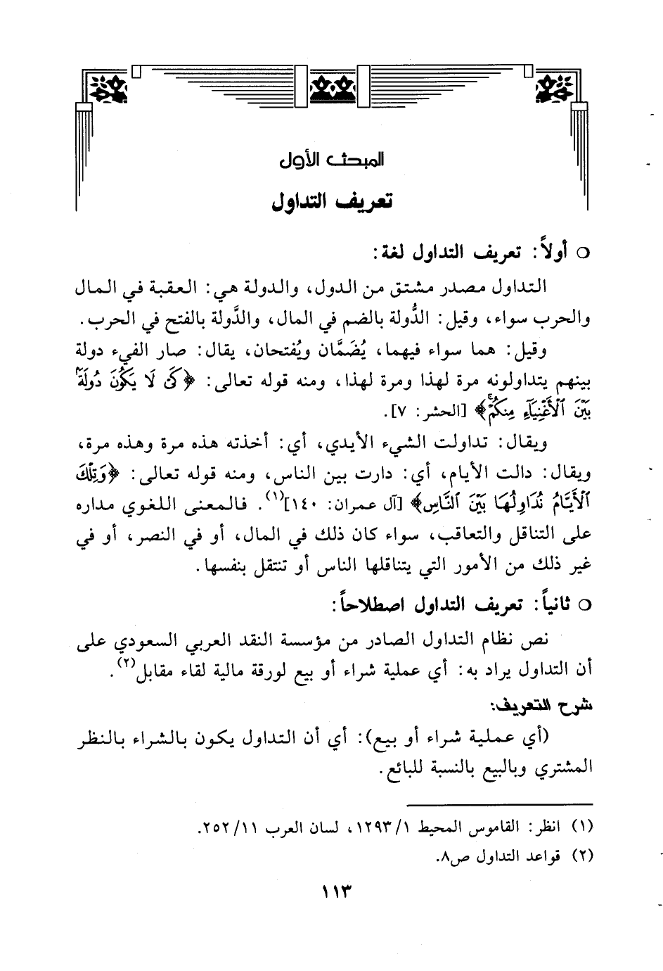 نص نظام التداول الصادر من مؤسسة النقد العربي السعودي على أن التداول يراد به: أي عملية شراء أو بيع لورقة مالية لقاء مقابل (¬2).