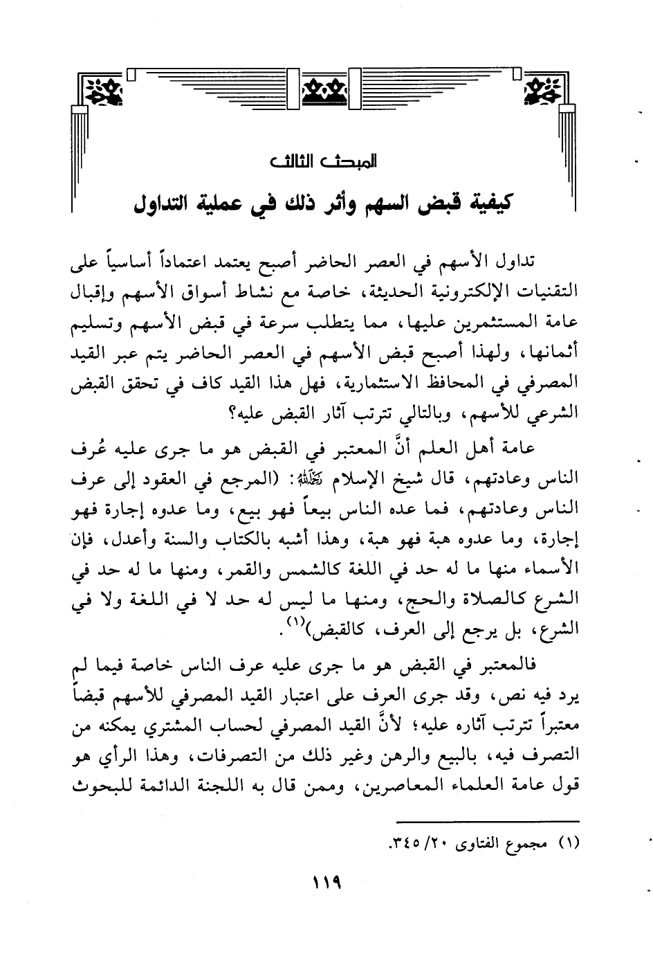تداول الأسهم في العصر الحاضر أصبح يعتمد اعتماداً أساسياً على التقنيات الإلكترونية الحديثة، خاصة مع نشاط أسواق الأسهم وإقبال عامة المستثمرين عليها، مما يتطلب سرعة في قبض الأسهم وتسليم أثمانها، ولهذا أصبح قبض الأسهم في العصر الحاضر يتم عبر القيد المصرفي في المحافظ الاستثمارية، فهل هذا القيد كاف في تحقق القبض الشرعي للأسهم، وبالتالي تترتب آثار القبض عليه؟