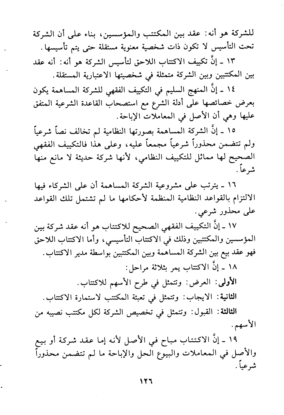 17 - إن التكييف الفقهي الصحيح للاكتتاب هو أنه عقد شركة بين المؤسسين والمكتتبين وذلك في الاكتتاب التأسيسي، وأما الاكتتاب اللاحق فهو عقد بيع بين الشركة المساهمة وبين المكتتبين بواسطة مدير الاكتتاب.
