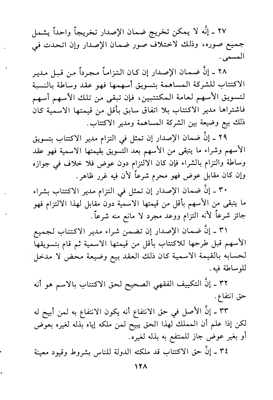 31 - إن ضمان الإصدار إن تضمن شراء مدير الاكتتاب لجميع الأسهم قبل طرحها للاكتتاب بأقل من قيمتها الإسمية ثم قام بتسويقها لحسابه بالقيمة الإسمية كان ذلك العقد بيع وضيعة محض لا مدخل للوساطة فيه.